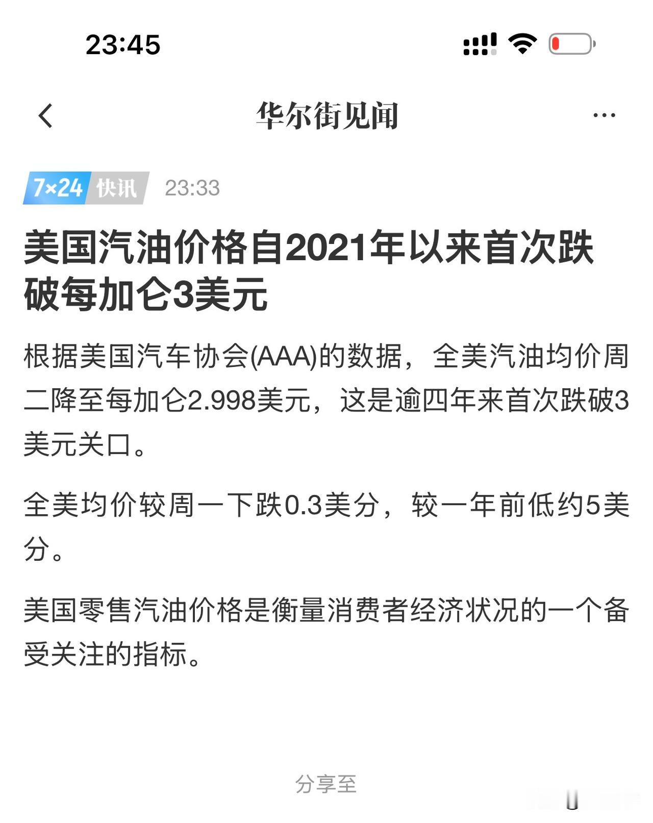 美国汽油已经8毛一升了。比水还便宜。如果水一块五一瓶,那么一瓶水可以换两瓶汽油。怪不得美国新能源发展不起来,这个油价,但凡考虑其他能源,都是脑子有病。但是话说回来,我们新能源这么厉害,导致用油车的越来越少,竟然都没撬动油价下跌。可见……可见什么?大家说说。