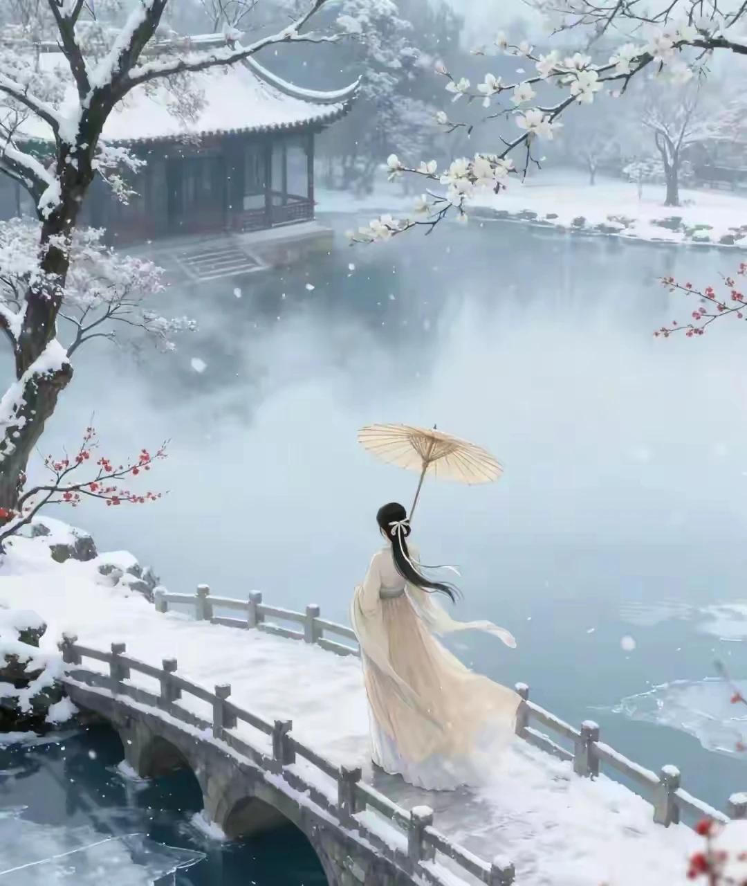 雪落群山裹素纱 水滨小镇静无哗 孤舟载得清寒去 玉树琼花景如画