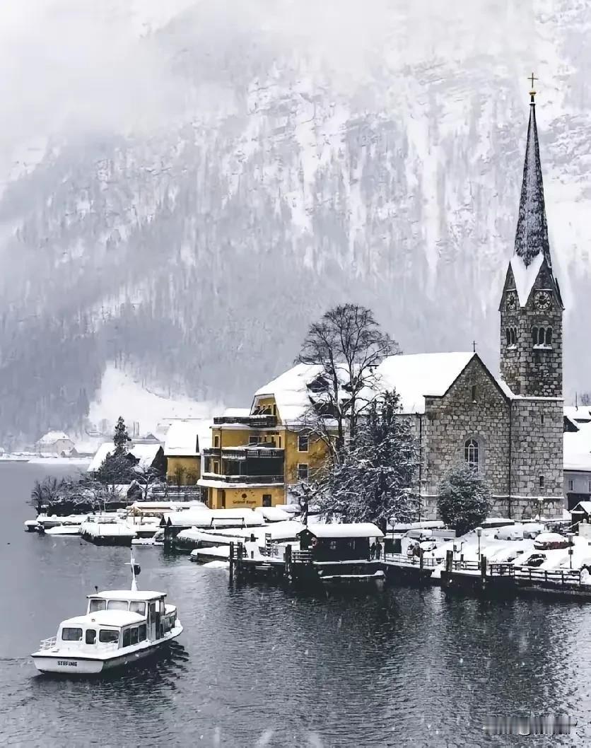 雪落群山裹素纱 水滨小镇静无哗 孤舟载得清寒去 玉树琼花景如画