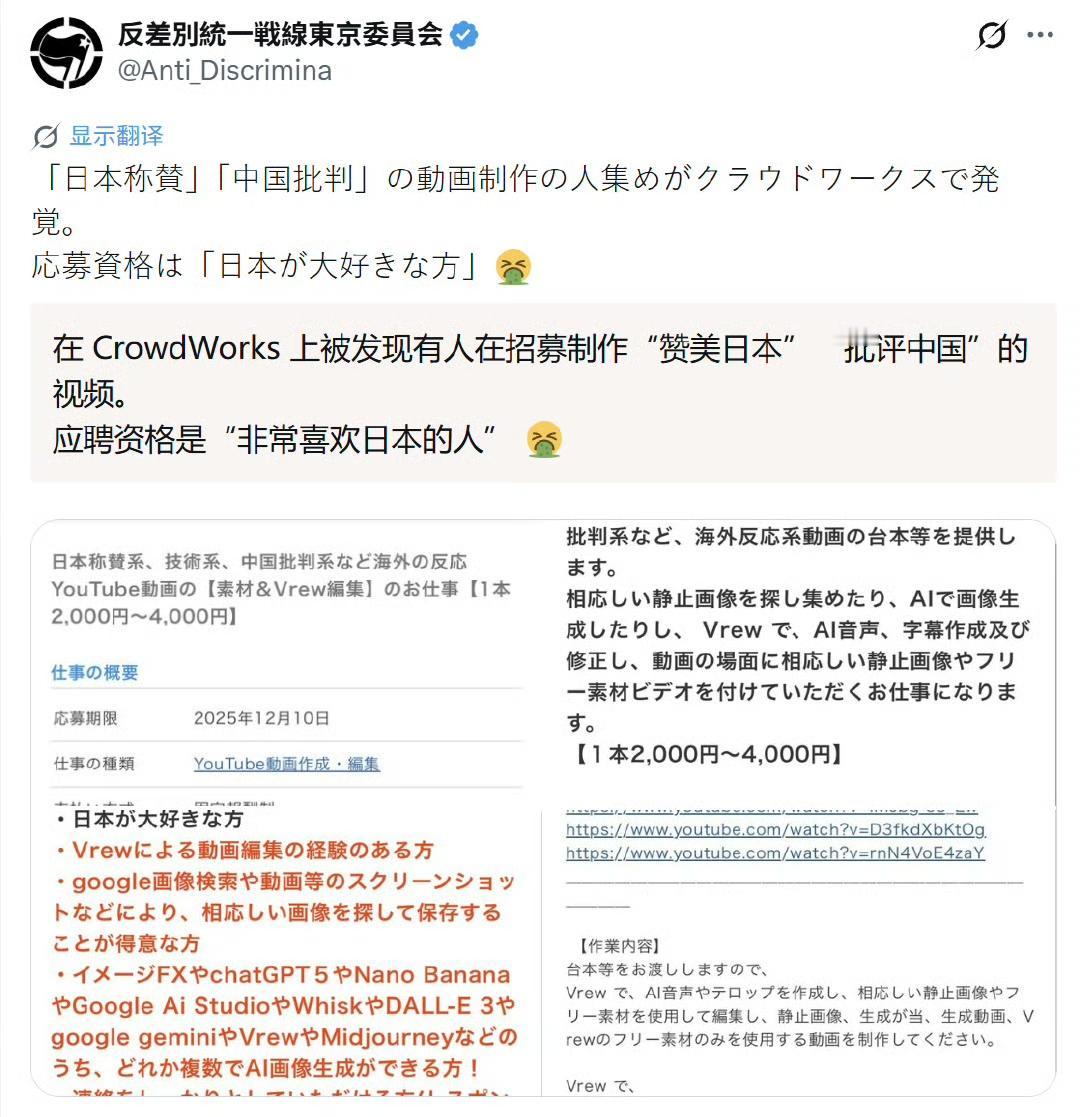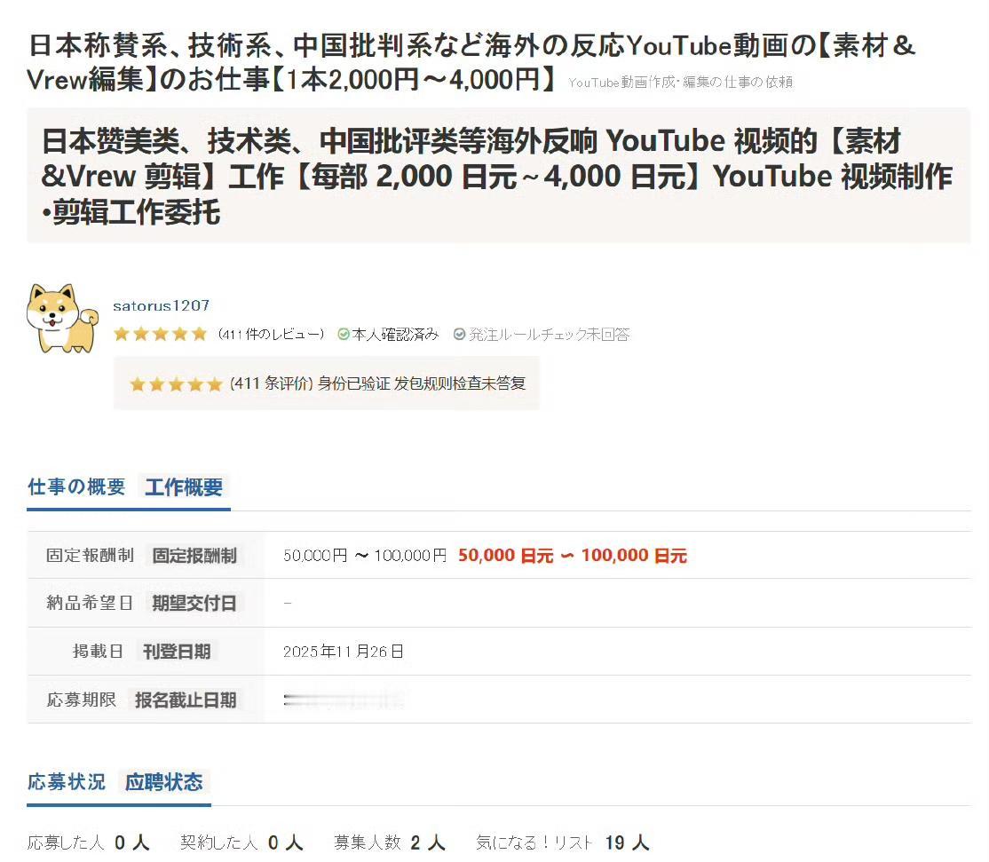 日本网民发现,有人在日本的众包平台上招募制作“赞美日本”“批评中国”的视频的剪辑人员。 应聘资格是“非常喜欢日本的人”。 看了下价格,一条视频的报酬是2000日元(约90人民币)-4000日元(180人民币),视频时间长度15分钟的2000日元,长度27分钟以上的4000日元。 主题要涉及:海外反应、趣味话题、家电、手机、半导体、材料、零部件、汽车、铁路等日本技术,日本文化、日语的魅力,以及中国人的不当行为和违反公德现象。 视频要发布在油管上。