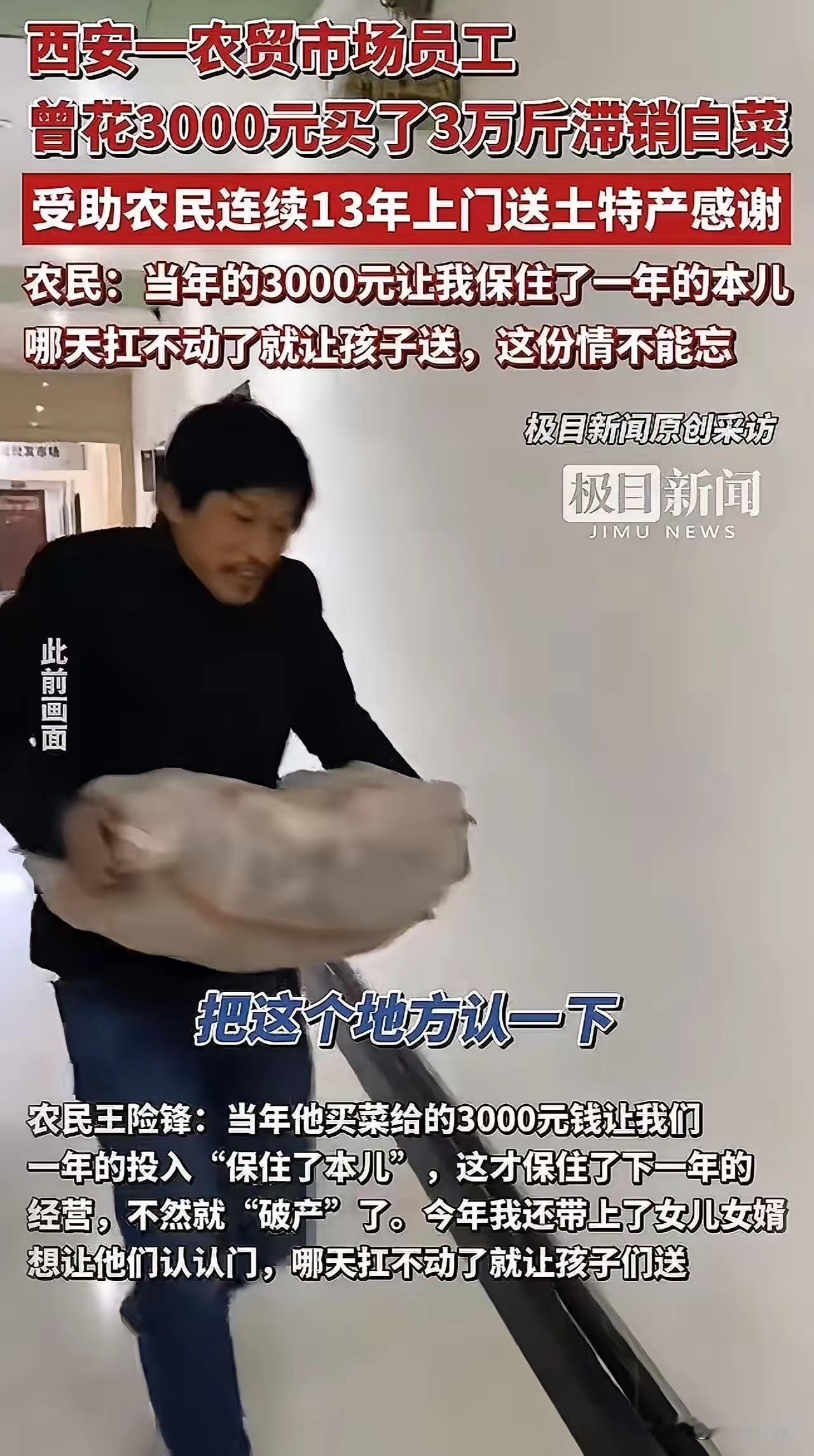 “这就叫知恩图报!”一句质朴的话语,吐露了农民对市场工作人员的深切感激。十三年来,农民始终坚持给市场工作人员送上土特产。这份坚持,既非迫于压力,也不是为了攀附关系,纯粹是源自内心深处的感恩与回报。 忆起往昔那段艰难岁月,农民的脸上仍洋溢着感激的笑容。那一年,农民遭遇了严重的农产品滞销,家中的白菜堆积成山,眼看着就要烂掉。就在这危急时刻,市场工作人员伸出了援助之手。他们掏出3000元,帮农民卖掉了三万斤滞销的白菜,不仅解了农民的燃眉之急,更让他们的辛勤劳作有了收获。那一次帮扶,恰似春风化雨,温暖了农民的心,也让他们看到了生活的希望。 这份恩情,农民一直铭记。为表感激,他决定以自己的方式回馈——每年都给市场工作人员送些土特产。这些土特产或许并不贵重,却满含着农民对他们的感恩与敬重。农民说:“我会一直送下去,哪天我扛不动了,就让孩子接着送,这份情不能忘!”这份坚持,既是对恩情的报答,也是对彼此情谊的珍视。 农民的举动,映射出中华民族的传统美德——感恩与回报。在这个快节奏的社会中,许多恩情或许会被遗忘,但农民用行动告诉我们,感恩不仅是一种美德,更是一份责任。无论身份贵贱、贫富差距,心怀感恩之人,都能在人际交往中寻得温暖与力量。 这十三年的坚守,虽是一份平凡的善意,却彰显了农民朴实而真诚的情感,也传递出一种正能量:感恩绝非一句空谈,更需用行动去践行。正如农民所言:“这份情不能忘。”在生活中,我们也应学会感恩,用真心回报那些曾帮助过我们的人。 这个感恩的故事,温暖了人心,也让我们坚信,善良与感恩,终将成为连接人与人之间最坚实的纽带。让我们用心感受身边的善意,用行动传递温暖,共同营造一个充满爱与感恩的社会。
