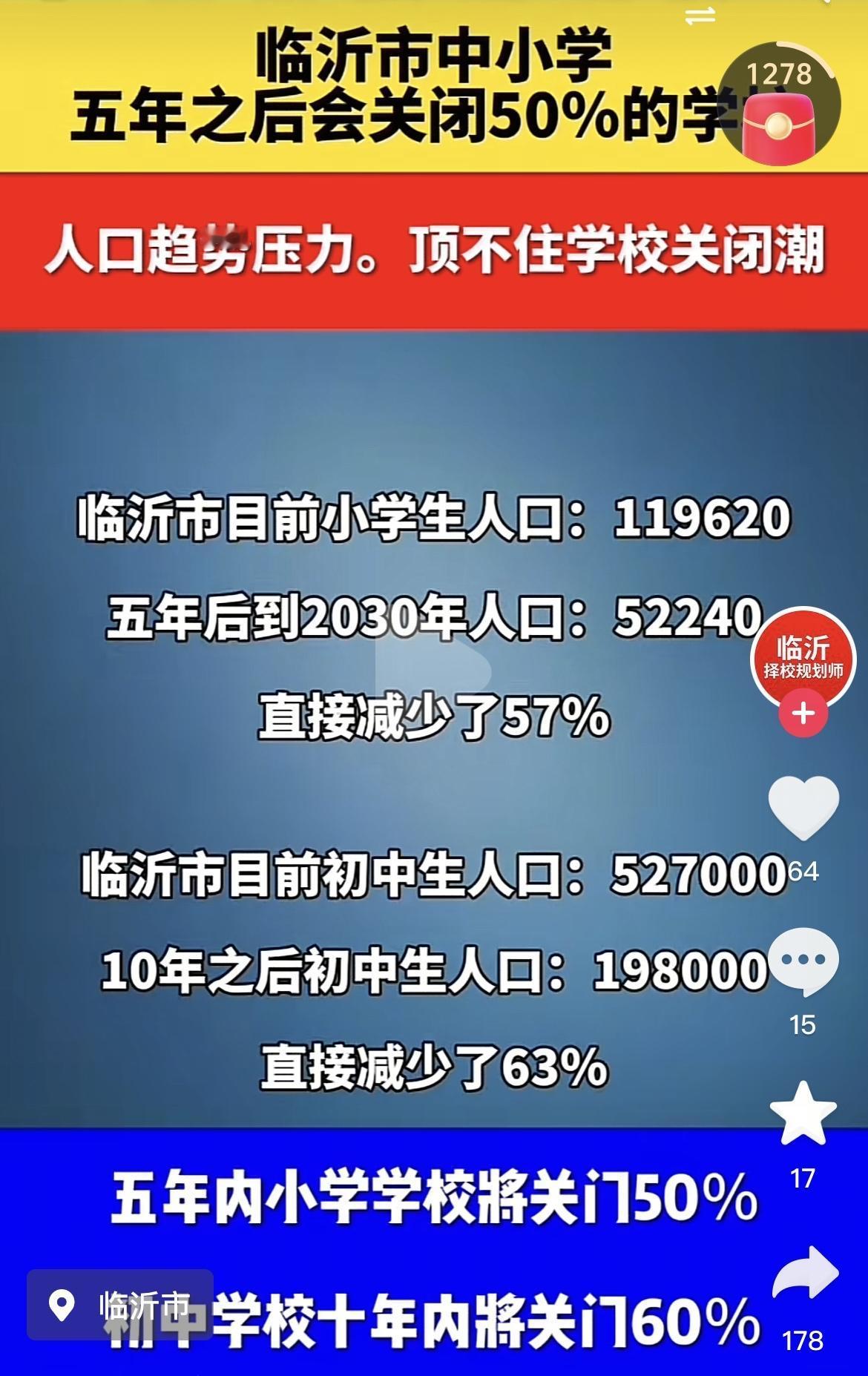 临沂的人口下滑有多厉害 数据能吓死你 作为山东第一人口大市人口近五年持续减少 尤其是在校生 小学生将会从今年今年的12万左右 锐减到五年后的5.7万人左右 几乎是60%下滑 初中生也会持续 届时将会有大量学校倒闭 大量关联产业消失 人是发展的根本和载体 没有人就无从发展 临沂要未雨绸缪 寻找新的发展出路