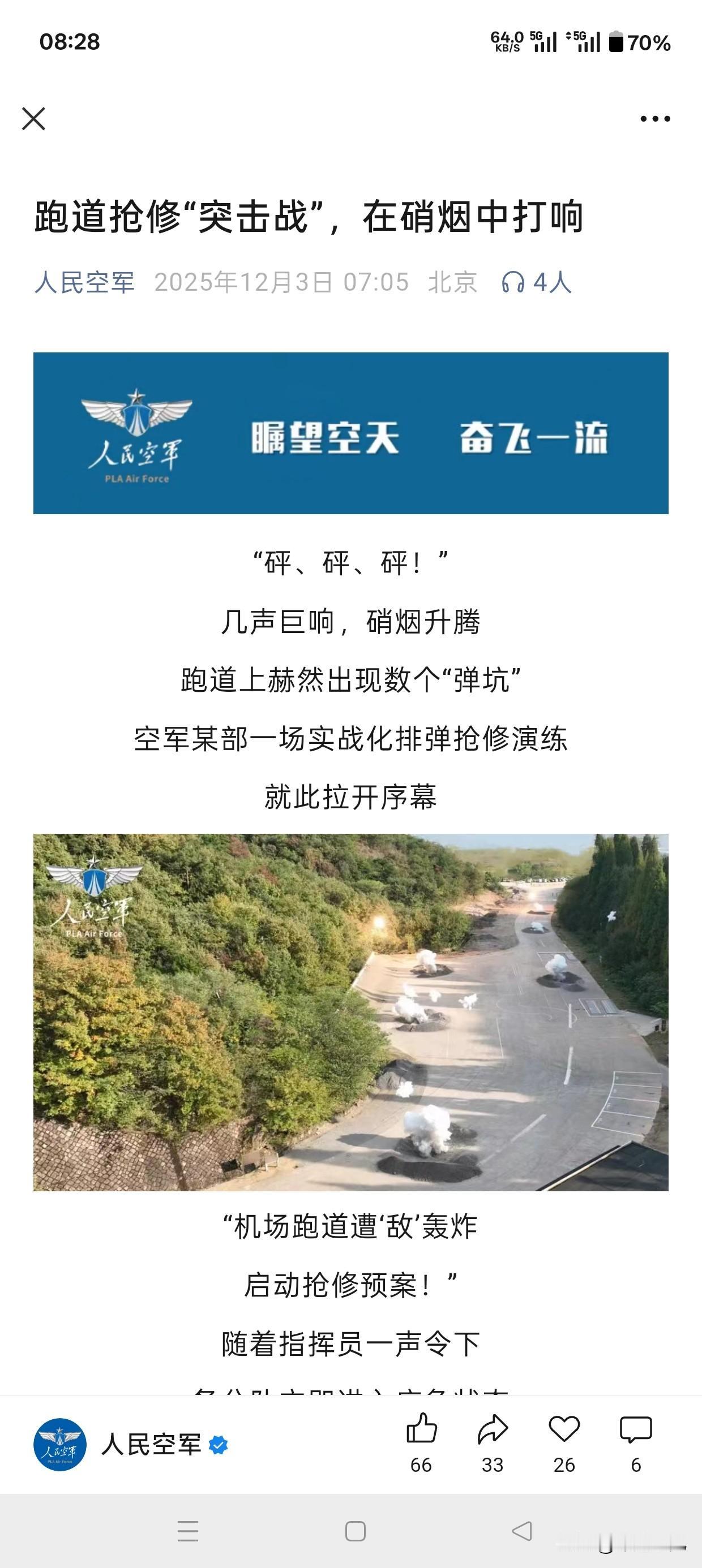是该练练了,空军某部演练机场炮弹被袭击,紧急抢修演练! 近日,空军某部也开展了应急演练,模拟机场跑道被炸,随后,启动应急预案,快速修复!挖掘机装载机迅速出场,清理弹坑内部,回填基料,修复路面,用的应该不是混凝土! 报道中,提到铆固、钻孔、吹尘、紧固,道面铆固组按流程精准操作!快速修复路面应该用的是钢板或是其他耐压材料,采用螺栓快速固定,迅速恢复机场跑道功能,确保战机能够起飞! 同时,还提到,有未爆弹,经过无人机勘测确定位置后,爆破组迅速前出,开展排爆诱爆作业,最后成功排除隐患! 这样的演练很有必要,如今,我们与外部势力发生局部冲突的可能性越来越高,提前演练,做好预案,未来战争真发生了,有备无患,迅速处置,确保战机起飞迎敌出击! 大家觉得呢? 空军基地演练 空军场站