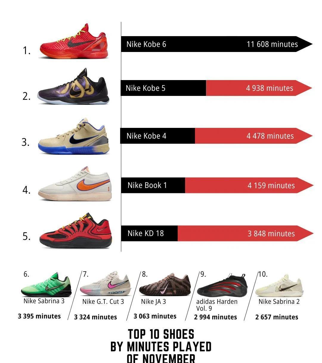 耐克声称,11 月份 NBA 球员穿着次数最多的 10 款球鞋中,有 9 款是耐克的产品。 Kobe 6 的穿着次数是排名第二和第三的 Kobe 5 和 Kobe 4 的两倍多。