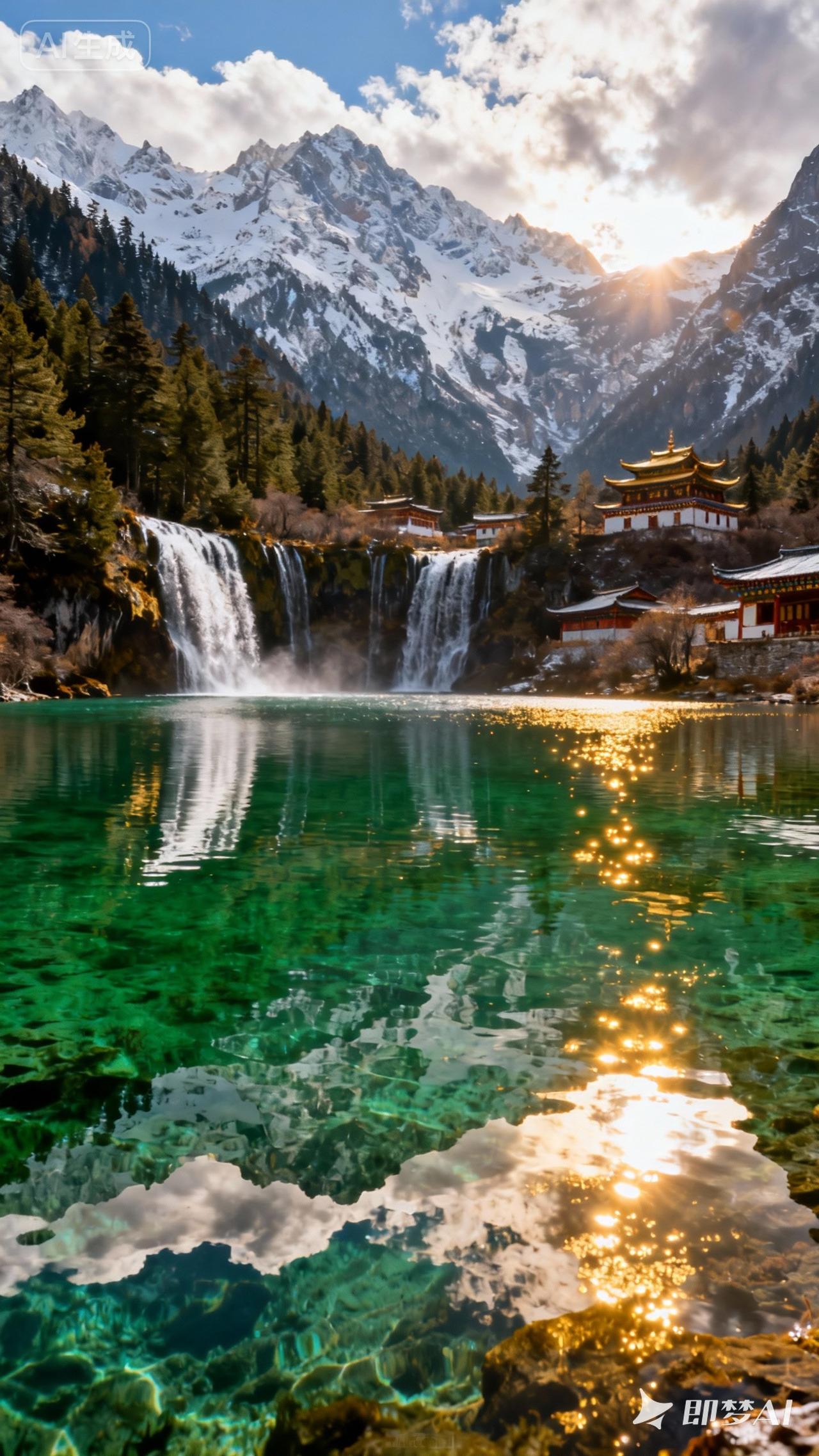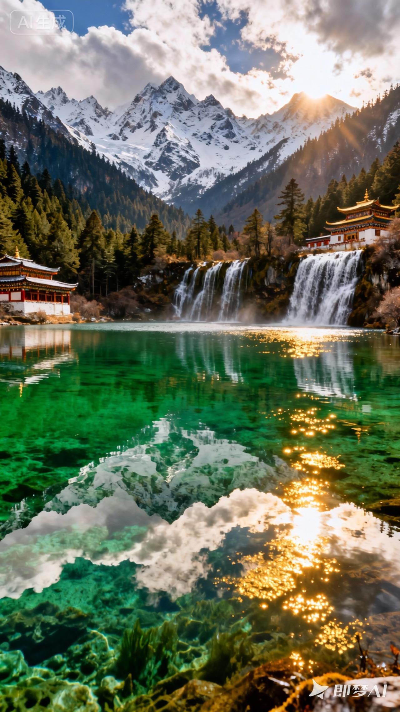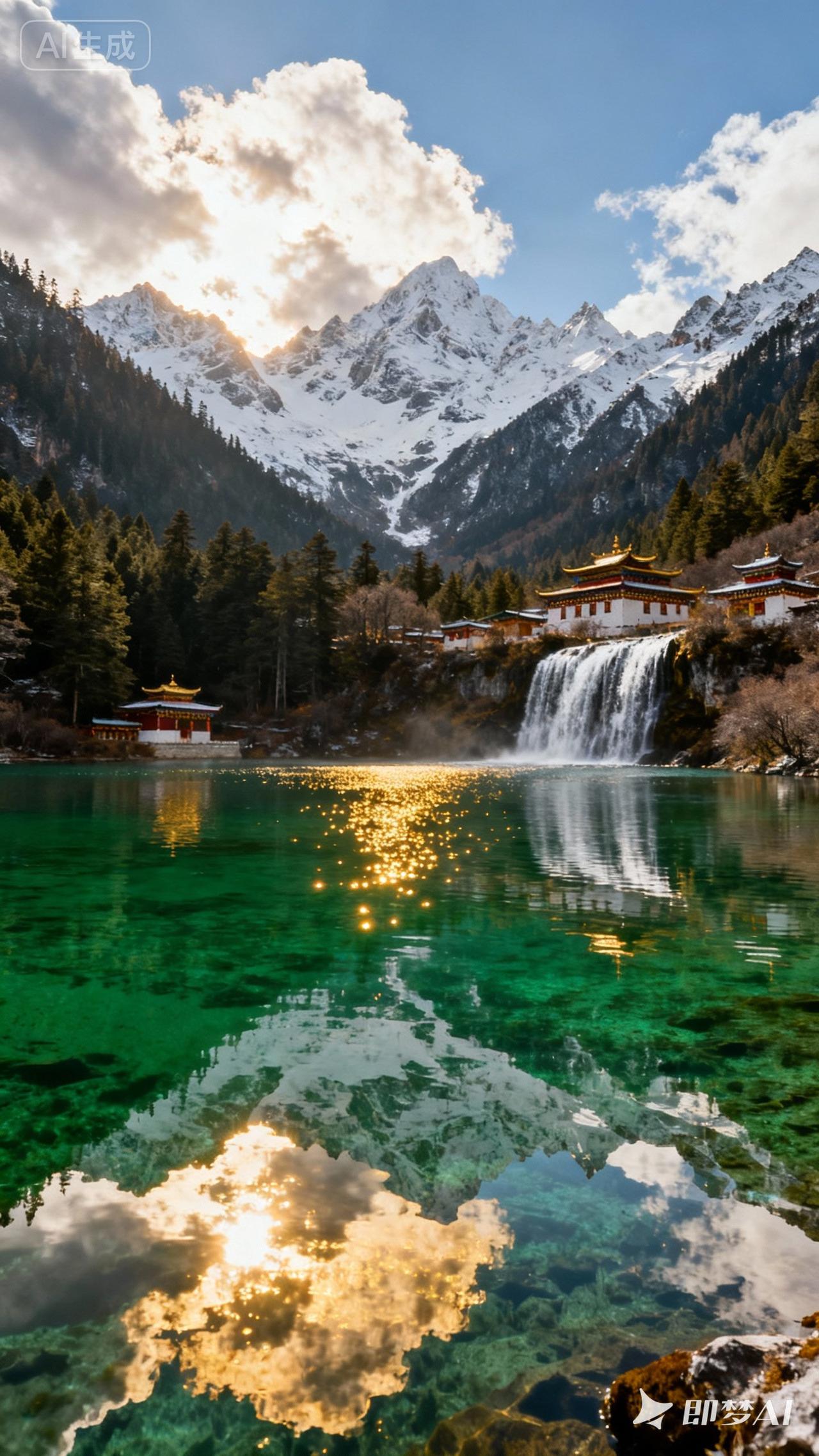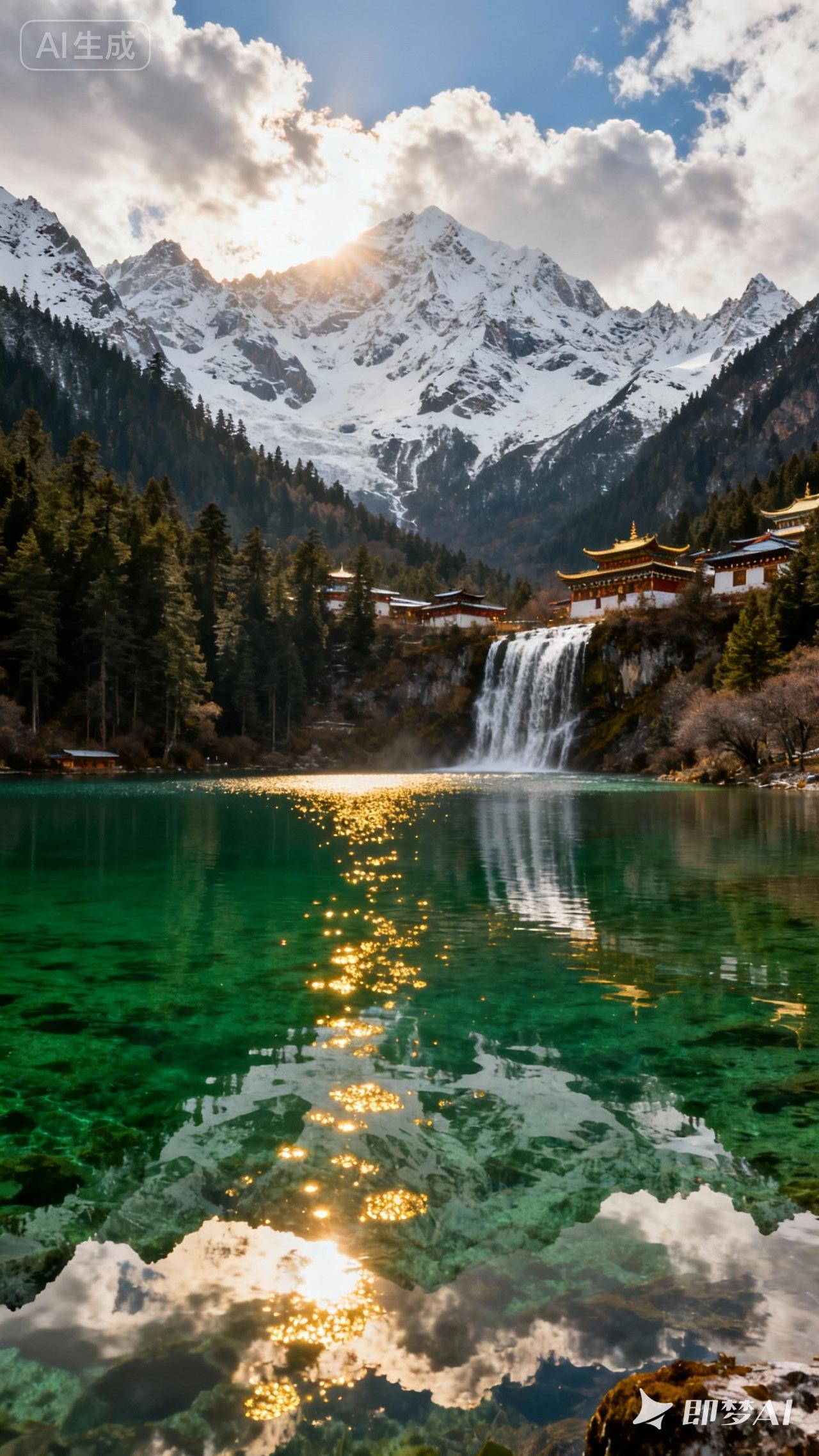 海子是大地遗落的绿松石,盛着半湖云、半湖雪——雪峰俯身吻向湖面,云影便沉在了翡翠底。飞瀑缠在崖壁上,碎成松风里的凉,连风都裹着松针香,把雪山的冷揉成了暖。 脚步要轻些,别惊碎满湖的金箔——那是阳光落在水面的细碎心事,每汪水都是自然的调色盘,攒着川西的四季:春的嫩、夏的翠、秋的浓、冬的白,都浸在这汪碧里,成了眼里化不开的柔。 风过处,连呼吸都沾着九寨的润,原来人间仙境从不是传说,是踩在栈道上时,一抬眼就撞进的、裹着山水的温柔里。