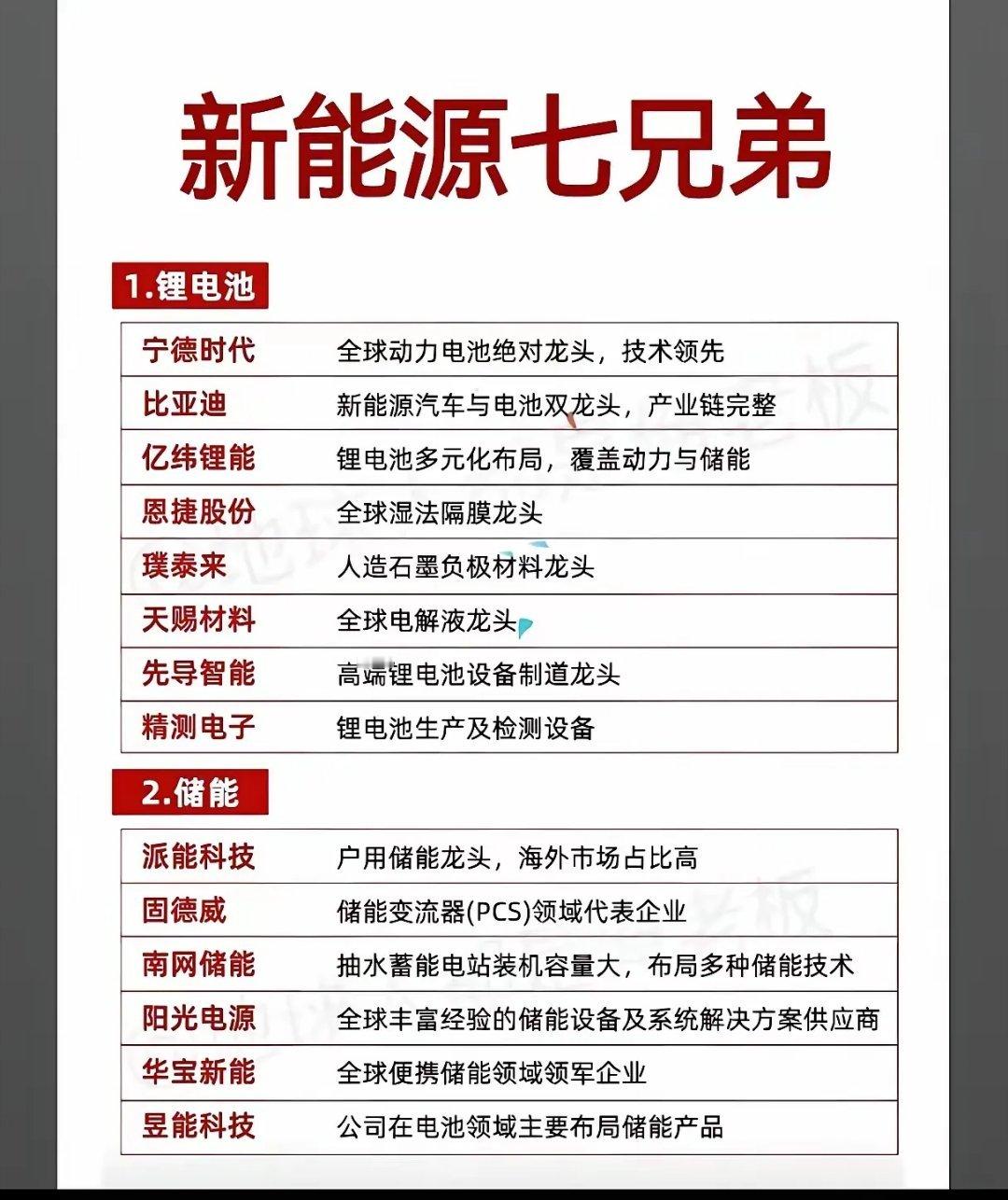 十五五规划锚定核心赛道:锂电池与储能板块优质企业全景梳理随着十五五规划正式落地,动力电池与储能产业已跃升为国家战略级发展领域,成为支撑新型电力系统建设、赋能新兴产业升级的核心支柱。未来,低空经济、人形机器人、大数据中心等新兴场景的爆发式增长,将催生对高性能电池的海量需求,为相关产业链企业打开长期成长空间。以下将对板块内核心优质企业进行系统梳理,助力把握行业发展脉络。锂电池产业链核心标的锂电池板块汇聚了从材料、制造到设备的全链条龙头企业,构筑起完善的产业生态:- 动力电池领域:宁德时代(全球动力电池装机量龙头,技术研发与产能规模双领先)、比亚迪(垂直整合产业链,刀片电池技术引领行业变革)、亿纬锂能(锂电池细分赛道标杆,在三元锂、磷酸铁锂领域均有核心竞争力);- 核心材料环节:恩捷股份(锂电池隔膜全球龙头,市占率稳居行业前列)、璞泰来(负极材料与电解液添加剂核心供应商)、天赐材料(锂电池电解液龙头企业,产品覆盖主流技术路线);- 设备与检测领域:先导智能(锂电池生产设备一体化解决方案提供商)、精测电子(锂电池检测设备领军企业,保障电池生产精度与安全性)。储能板块优质企业矩阵储能作为新能源消纳的关键环节,在十五五规划中被赋予重要使命,板块内企业聚焦储能系统集成、核心部件制造等领域:派能科技(家用储能系统龙头,海外市场布局完善)、固德威(储能逆变器核心供应商,技术性能对标国际一流)、南网储能(电网侧储能标杆企业,依托电网资源优势持续扩张)、阳光电源(全球新能源发电与储能解决方案领导者)、华宝新能(便携式储能龙头企业,C端市场认可度高)。尽管锂电池与储能板块的核心企业集群相对集中,但行业成长天花板极高。在十五五规划推动下,随着技术迭代加速与应用场景扩容,两大板块将在未来经济转型中扮演关键角色。值得关注的是,若国轩高科、比亚迪、欣旺达等企业在固态电池领域实现技术突破并成功量产,将彻底重构动力电池行业竞争格局,引发全球范围内的能源动力革命,为产业链带来新一轮价值重估。