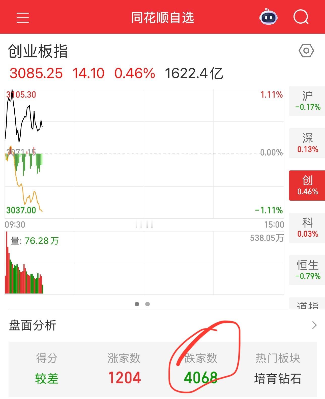 唉,指数红的,但已经四千多家公司绿了。我发现只要创业板易中天那几只涨的好,大部分公司就得下跌。