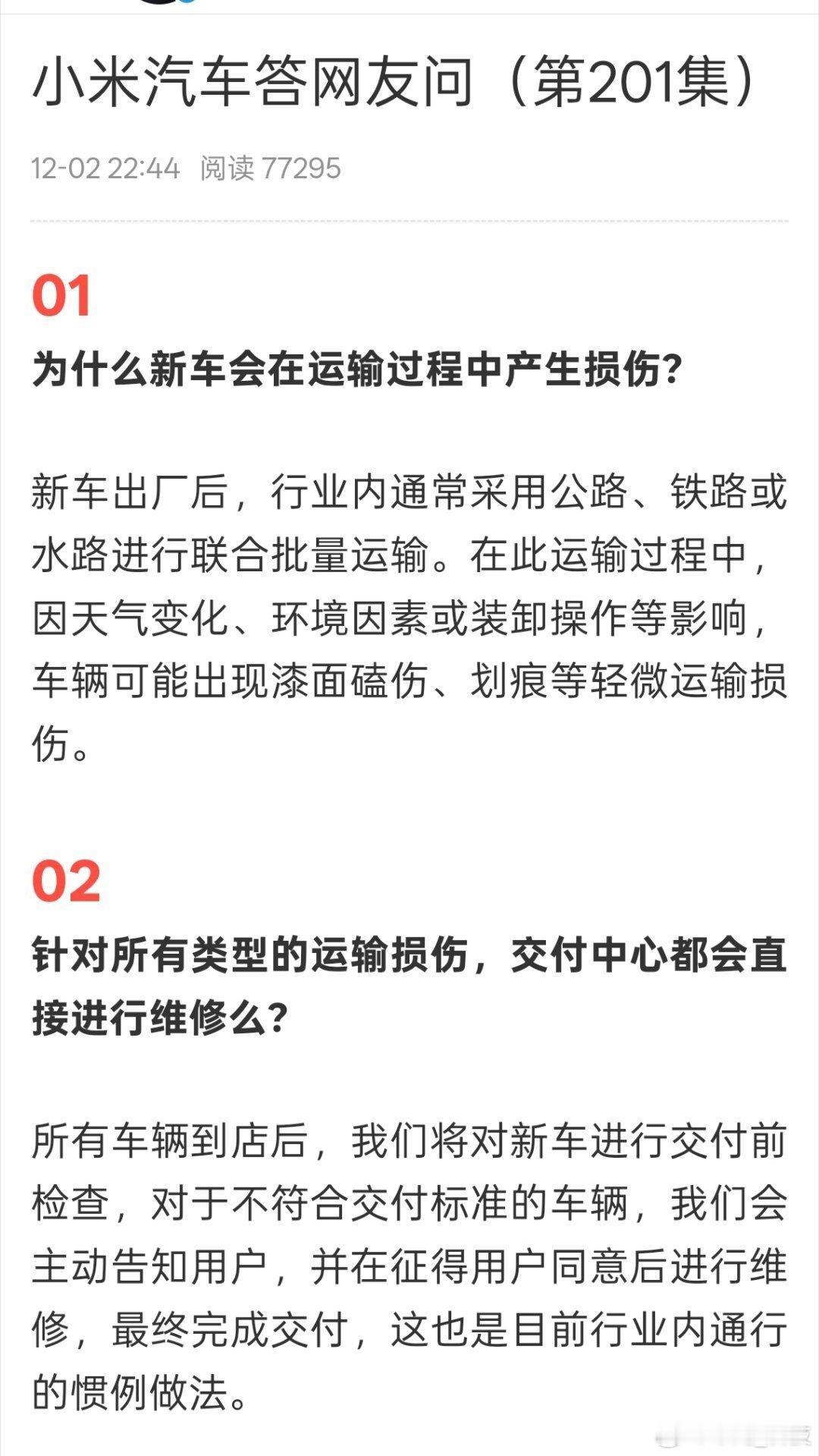 小米汽车回应新车在运输中损伤小米汽车回应运损车是否直接维修新车在运输中出现损伤,会主动通知车主并征得用户同意在进行维修。