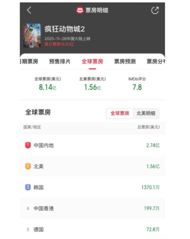 上映6天中国票房突破,《疯狂动物城2》的票房成绩,让世界再度认识到中国市场的实力。 以83%排片贡献95%单日票房,带动11月总票房创6年新高。同期国产片《狂野时代》5天仅817万票房。 中国以单一市场之力贡献全球过半票房,彻底颠覆好莱坞对华保守预判。 截至11月30日,《疯狂动物城2》上映首周,中国内地票房报收2.74亿美元,超越北美票房成绩,成为本片全球第一大票仓。 有预测说,《疯狂动物城2》票房将达到42.36亿,这将超越《复联4》(42.5亿)成中国影史进口片总冠军。 影片热度不仅席卷电影市场,更对A股影视、消费等多个相关板块形成拉动作用。 这份成绩也是让外媒很是惊叹。 《疯狂动物城2》的成功是中国市场影响力、IP效应和成熟营销共同作用的结果。 所谓的影视寒冬不过是某些人的借口罢了。这部电影的成功再度证实,优质内容可激活任意档期。