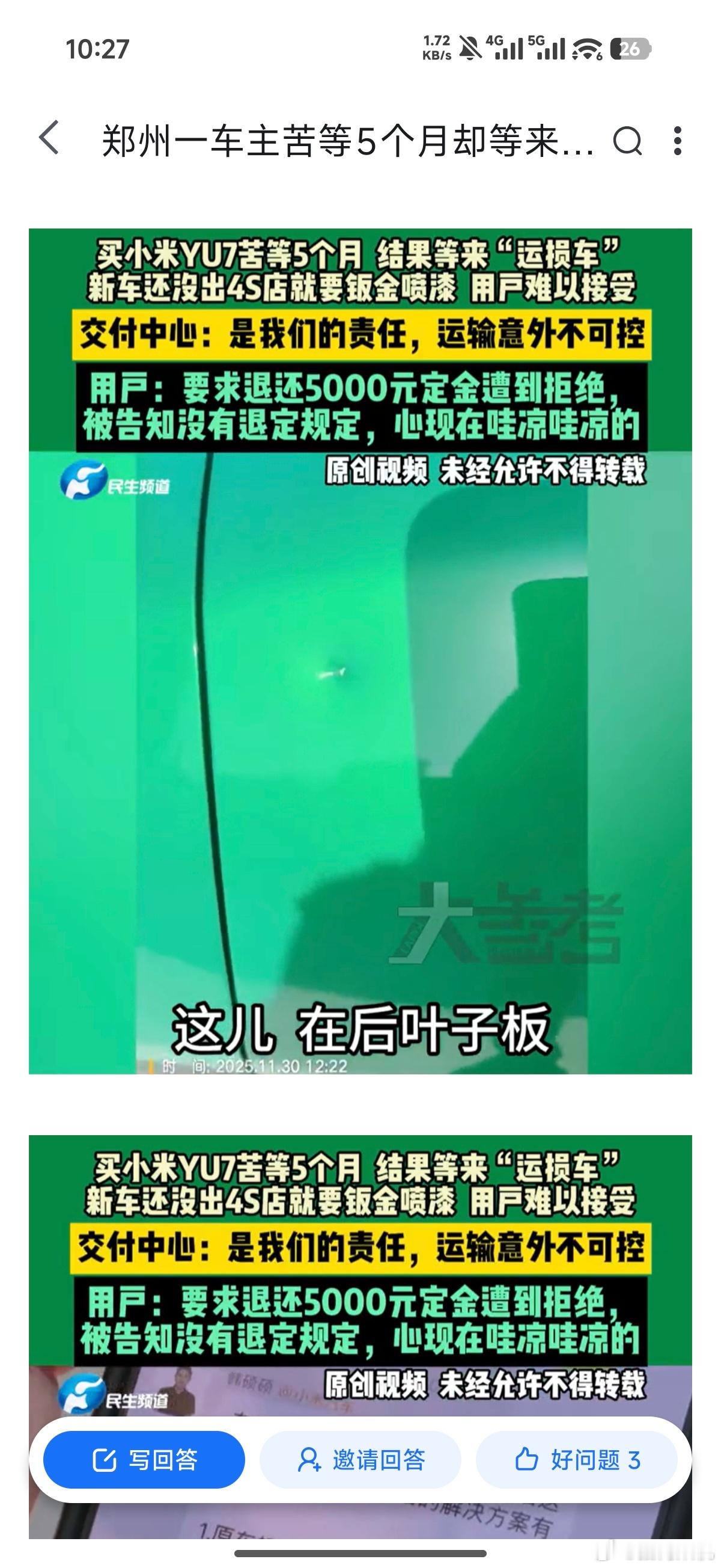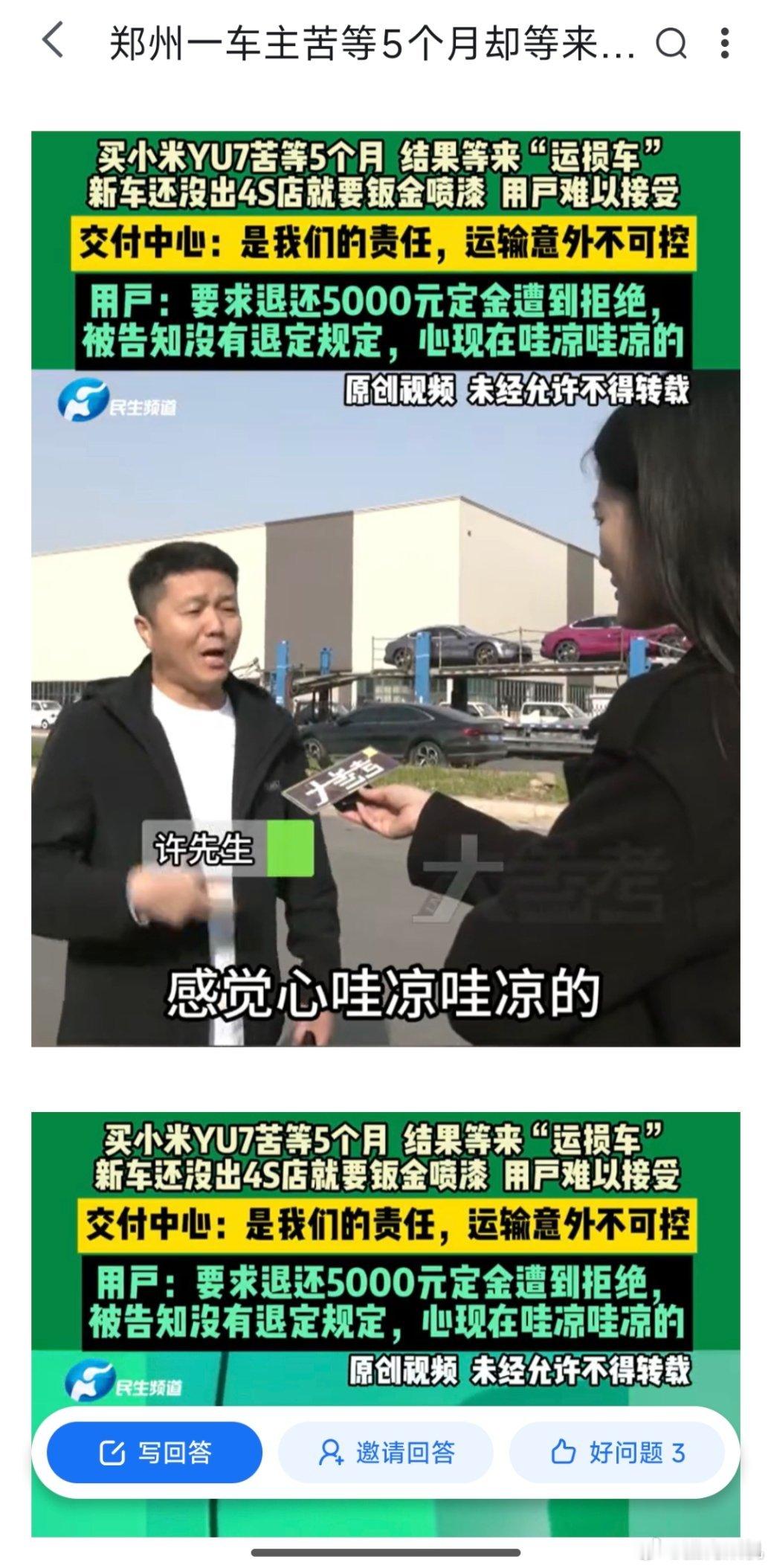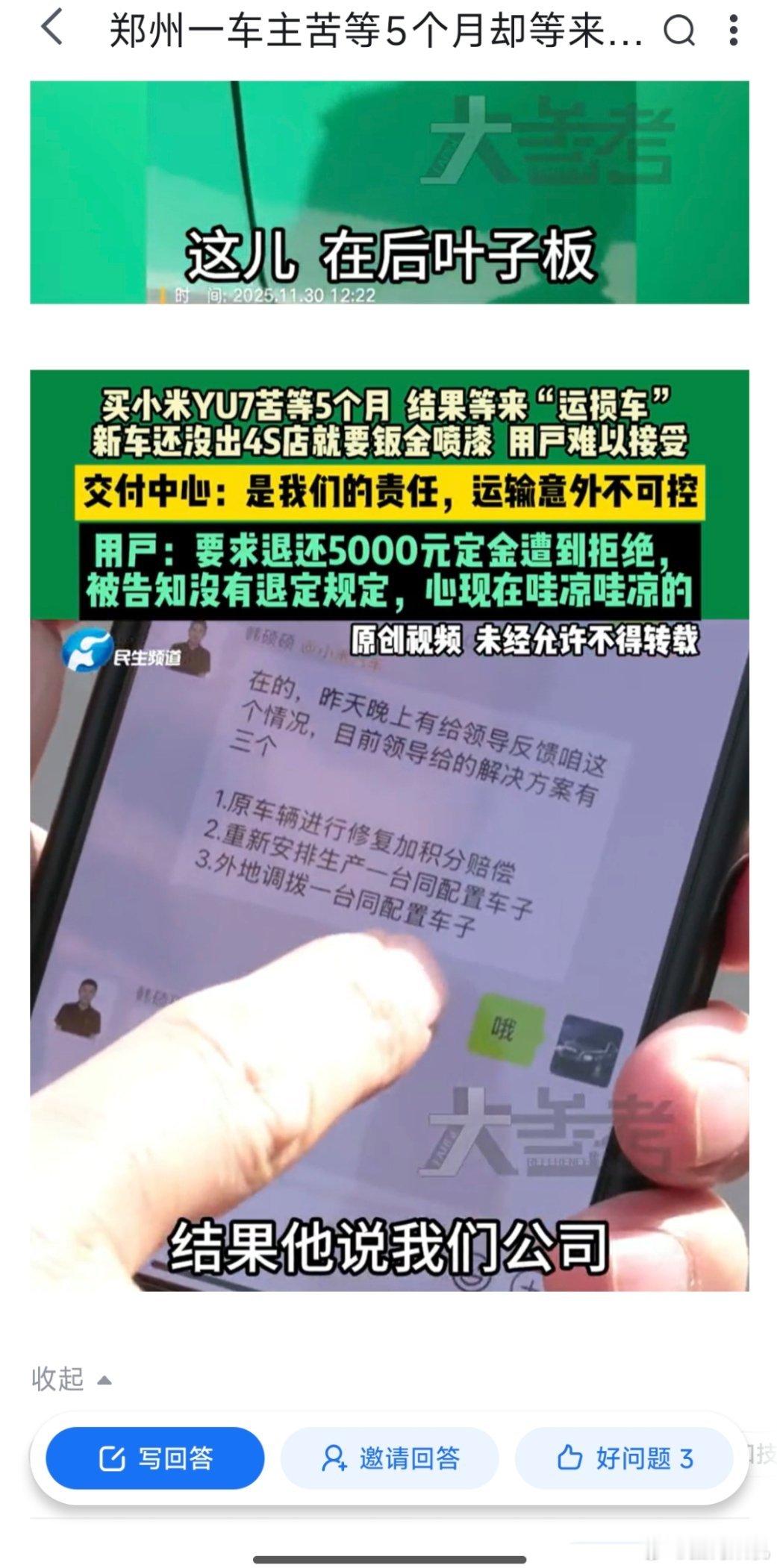 看这标题我以为是小米硬要卖运损的小米YU7给车主,但实际上还有调配新车或者等重新下线两个选择。这样的话,退定金基本是很难的。看图里是叶子板的位置,虽然面积不是很大,但可能车主比较追求完美,而且也是小米运损在先。