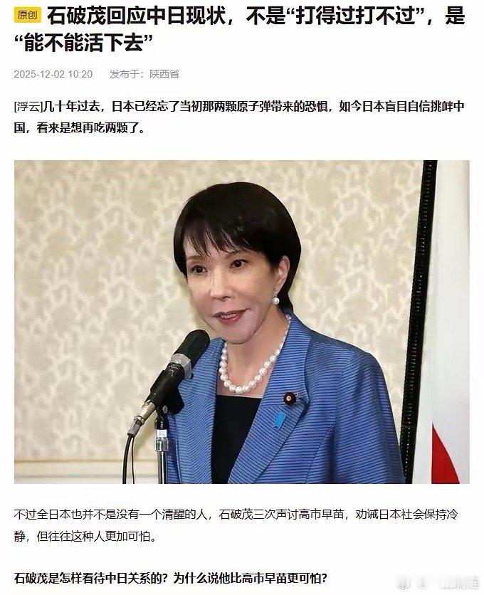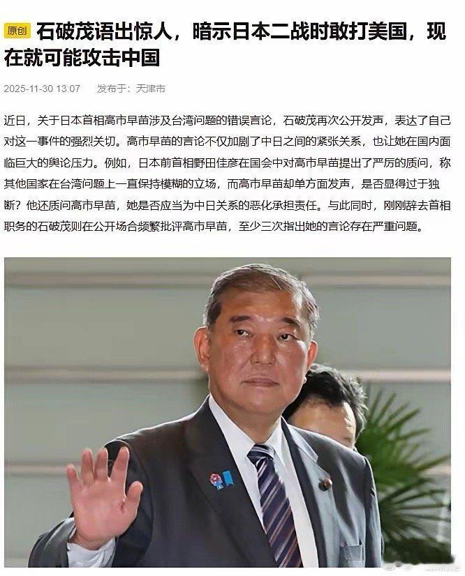 有媒体报道:石破茂在回答记者提问:中日会否有一战时,他语出惊人!在最近的一期电视节目中,石破茂在回答记者就高市早苗挑衅中国的言论提问:中日会否将有一战时?他如实回了一句反问:当年明明知道国力和美国差了十倍,为什么还要去偷袭珍珠港呢?人所共知,正因为当年日本偷袭了美军基地珍珠港,才导致美国报复性地对日本本土大轰炸,并向广岛、长崎投放了两枚原子弹,导致日本投降。石破茂拿这个事回答记者的提问。是因为他认为这一事件可以为我们提供一些警示。石破茂指出,二战时,日本根本不可能战胜美国,国力差距大约有十倍,但即便如此,日本依然选择发动战争。日本当时的首相东条英机曾给出解释,说如果不试试怎么知道结果,战争就是时运。这番话体现了日本当时冒险主义的倾向,也反映出一种不顾后果、只求行动的心态。石破茂认为,这种思维方式至今并未得到彻底反思。他认为高市早苗挑衅中国的言行,如同当年挑衅美国一样危险。当时,明知道日本偷袭珍珠港会遭到美军的报复,但是,还是抱有侥幸心理。现在不是也一样吗?日本明知道,中国比日本无论是经济或军事都强大了几倍、十几倍的国家,明知道台湾是中国的内政、是中国的核心利益,却还非要挑衅,结果会是一样的。这说明,石破茂在日本退出的领导人中还是位明白人。可惜,在日本国极右翼势力强大的今天,对他的意见,没有人能听进得进去了。石破茂的回答,也说明,中日之间不是“会不会打”的问题、也不是日本“打过打不过”的问题,而是日本“能不能活下去”的问题。有媒体评论到:这句话之所以扎心,不在于它复述了历史,而在于它精准地“预言”了现在。