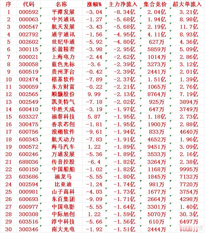 12月3日开盘45分钟,主力资金“卖出的 ”30名单!平潭发展:净流入 -8.34亿元中兴通讯:净流入 -5.68亿元航天发展:净流入 -5.68亿元通宇通讯:净流入 -4.95亿元世纪华通:净流入 -4.80亿元