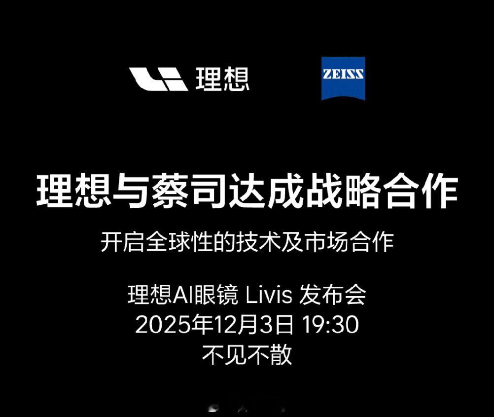 理想的 AI 眼镜 Livis 官宣和蔡司合作,这个跨界跨得有点大,但考虑到两个品牌的影响力,今晚的发布会有点意思了。这款眼睛李想之前透露过五大亮点:轻、长续航、行业TOP镜片、极速互动、无线便捷充电。深度捆绑理想汽车、加上蔡司多年的技术品质,理想做AI眼镜决心算是打出来了。理想汽车蔡司
