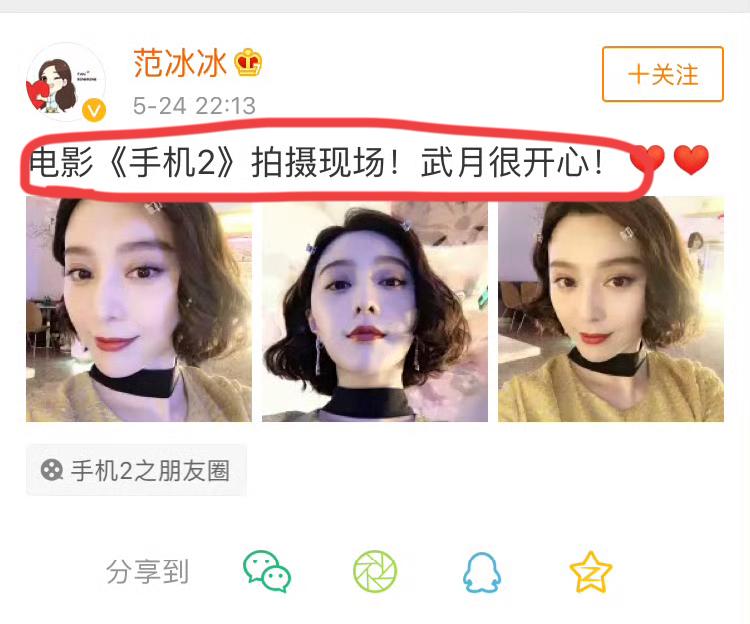 当年手机2,开拍的时候; 冰冰发了一条微博: 电影《手机2》开拍,武月很开心。 万万没想到,就是这简单的一条微博; 惹得小崔很不高兴,他连续出大招斗法冰冰; 并在不久之后,揭开娱乐圈阴阳合同偷漏税的惊天内幕; 这个事件,应该具有划时代的意义。 冰冰被最终罚款8.84亿,交了之后,免于刑事处罚。 此后,这部电影也彻底没有消息,更不可能拍摄了。 手机的电视剧版两年后上映,王志文和陈道明主演的; 这个还是很详细的,毕竟是36集的电视剧。 为何小崔觉得这部电影在映射他呢? 你看了电影版本的手机么,是在隐射小崔么? 小崔打司马之后,很快也消失在网络; 大司马之后打某想,大获成功,现在因为偷税被罚900多万,也消失了。 网红,大佬,在网络上也是各领风骚三几年啊!!