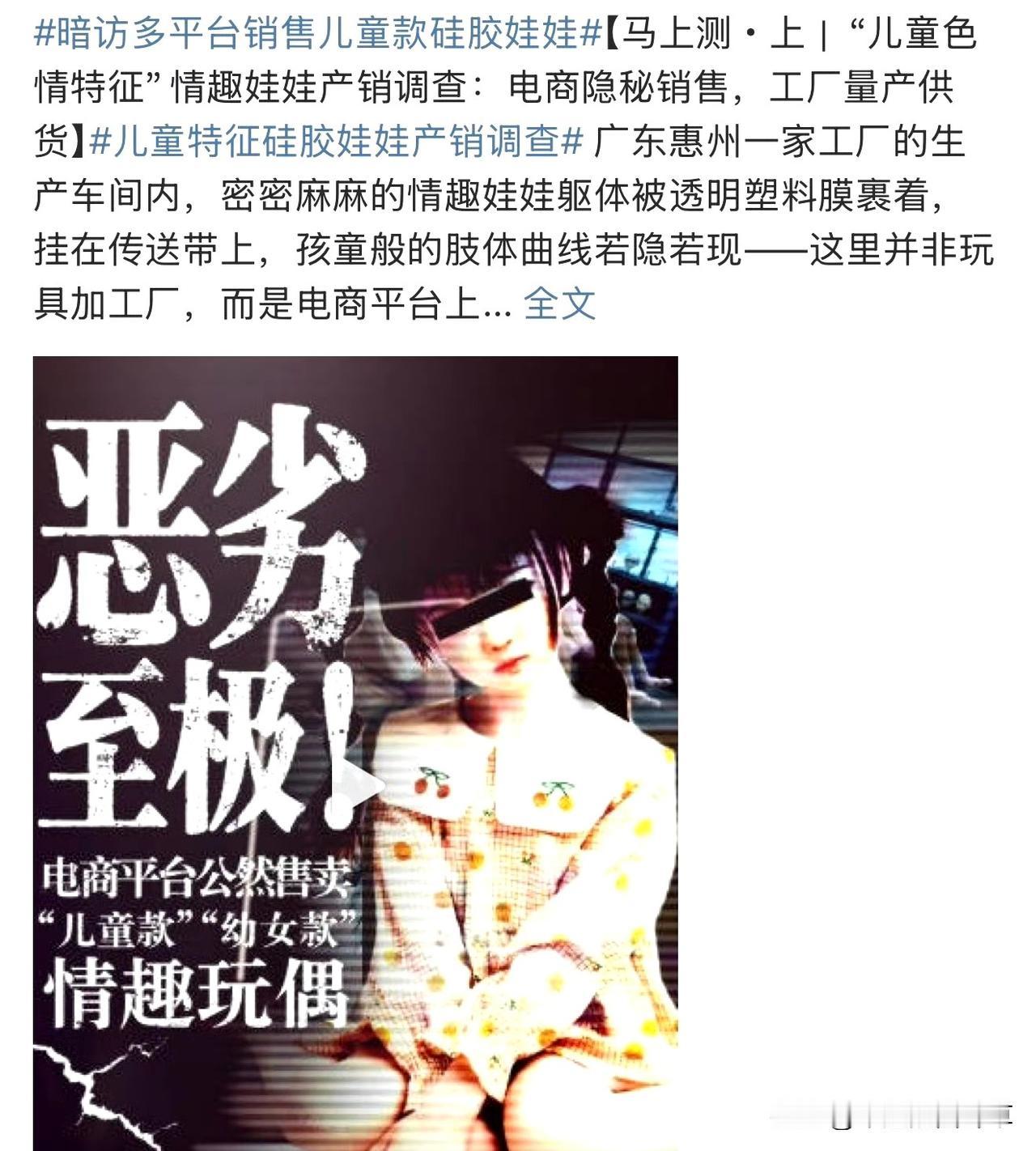 有些东西存在就是不对劲的。 幼童款硅胶娃娃还能光明正大卖,实在让人难以接受。 电商平台搜“童颜娃娃”跳出来的,名义上是成人用品,拆开却是复刻未成年人的面庞和身形,还搭配相关低俗配件,标注加热等违规功能,这根本不是普通玩具。 实地探访更让人震惊,惠州当地部分工厂里挂满这类娃娃,工人说三五天就能完工,还明确分儿童款、成人款,儿童款复刻未成年人身体特征,功能可随意选配,发货时竟打着“健身用品”的幌子掩人耳目。 售卖这类商品的人真该好好想想,它传递着扭曲的价值观,甚至可能诱导不良意图者将目光转向真实孩童,这种潜在危害带来的后果,谁能承担得起?