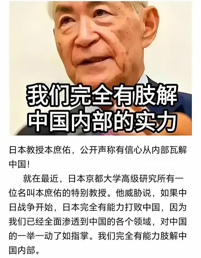 日本教授本庶佑曾公开叫嚣“有能力从内部瓦解中国”,宣称中日开战即可取胜,底气源于其所谓“已全面渗透中国关键领域”。这番言论虽显狂妄,却暗藏值得警惕的风险——暗战就在你我身边。 近日,高志凯教授也提醒大家:我国虽在军事、科技领域已有相当实力,但对日本绝不能盲目自信;中日若再发生冲突,暗战恐怕比明面上的军事对抗更致命。他提到,改革开放以来,不少日本人以各类身份长期在华活动,其中不乏潜伏者,早已悄悄渗透到我们的关键领域,还暗中拉拢培养了一批危害国家安全的内应。 因此,彻底清除这些汉奸、间谍等危害国家安全的势力,已刻不容缓!一句话,“对待小日本,不可掉以轻心,怎么谨慎都不为过!”国家安全 警惕渗透