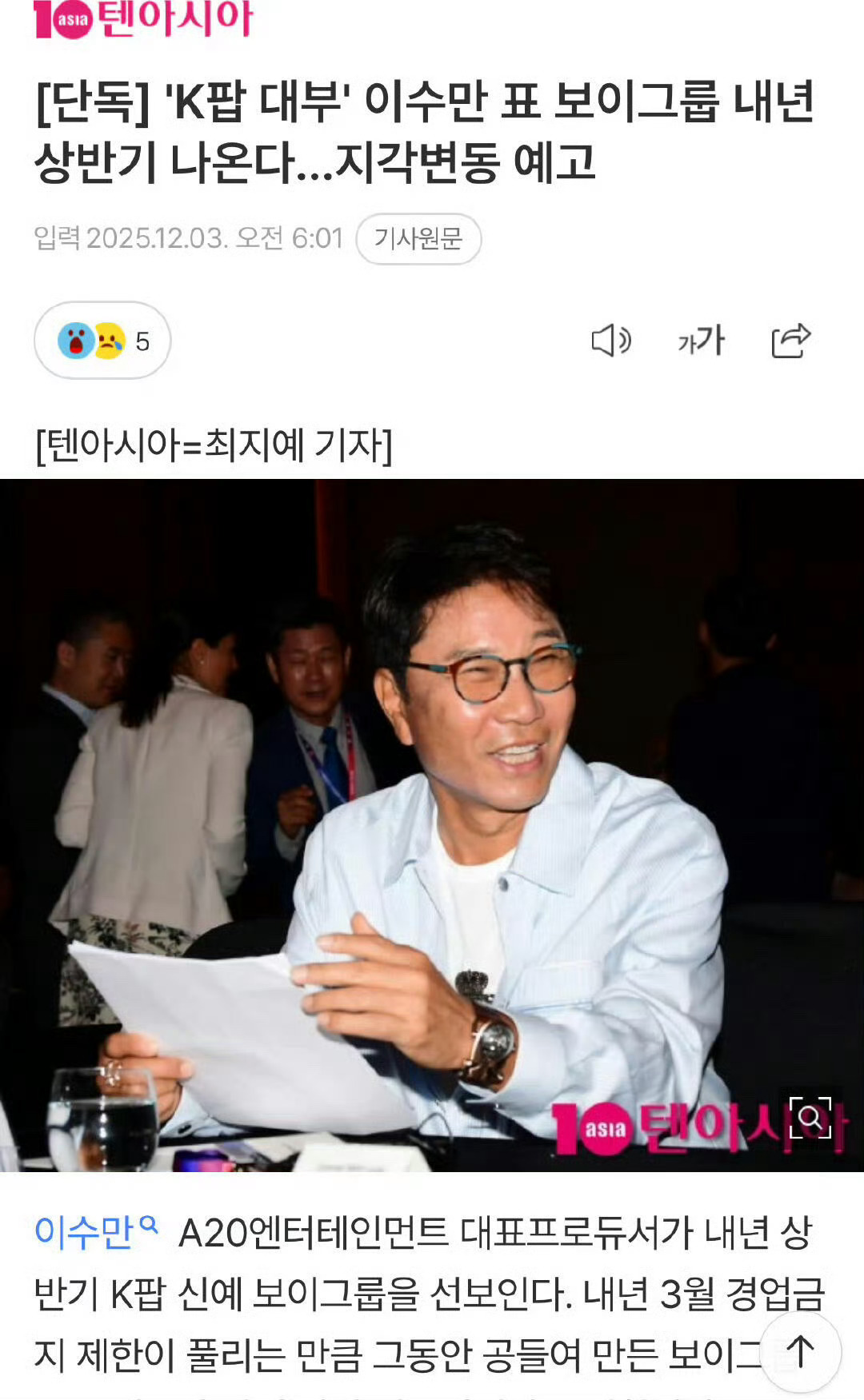李秀满新男团明年上半年出道 据韩媒报道,著名制作人李秀满将以A20娱乐代表的身份,于明年上半年正式推出其精心筹备的K-POP新锐男团。随着其相关的经营限制预计在明年3月解除,该男团将在韩国本土市场正式亮相。