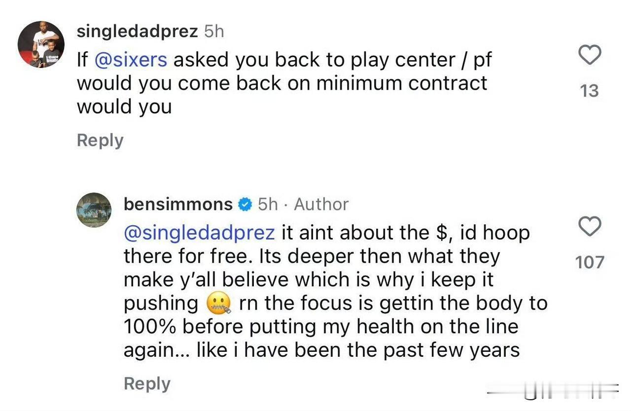 西蒙斯愿意免费为76人效力!!!本-西蒙斯的身体仍没有100%康复! 自由球员