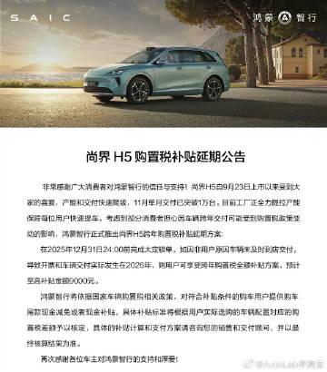 尚界H5的购置税补贴终于来了,12月31号完成大定锁单就能领,最高9000元【来自懂车帝车友圈】