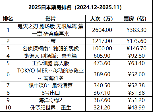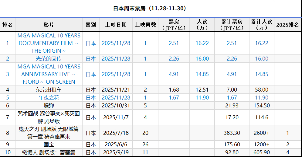 日本周末票房(11.28-11.30):1. Mrs.GREEN APPLE两部演唱会电影同时开画成绩优秀,《MGA MAGICAL 10 YEARS DOCUMENTARY FILM ~THE ORIGIN~》人次夺冠;2.《链锯人 剧场版:蕾塞篇》累计票房92.8亿排名日本影史第65。(数据来源:kogyotsushin、dorama)
