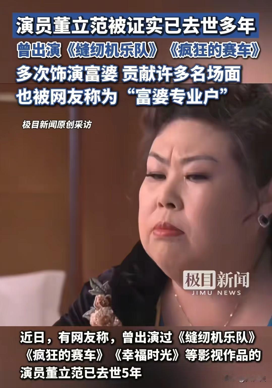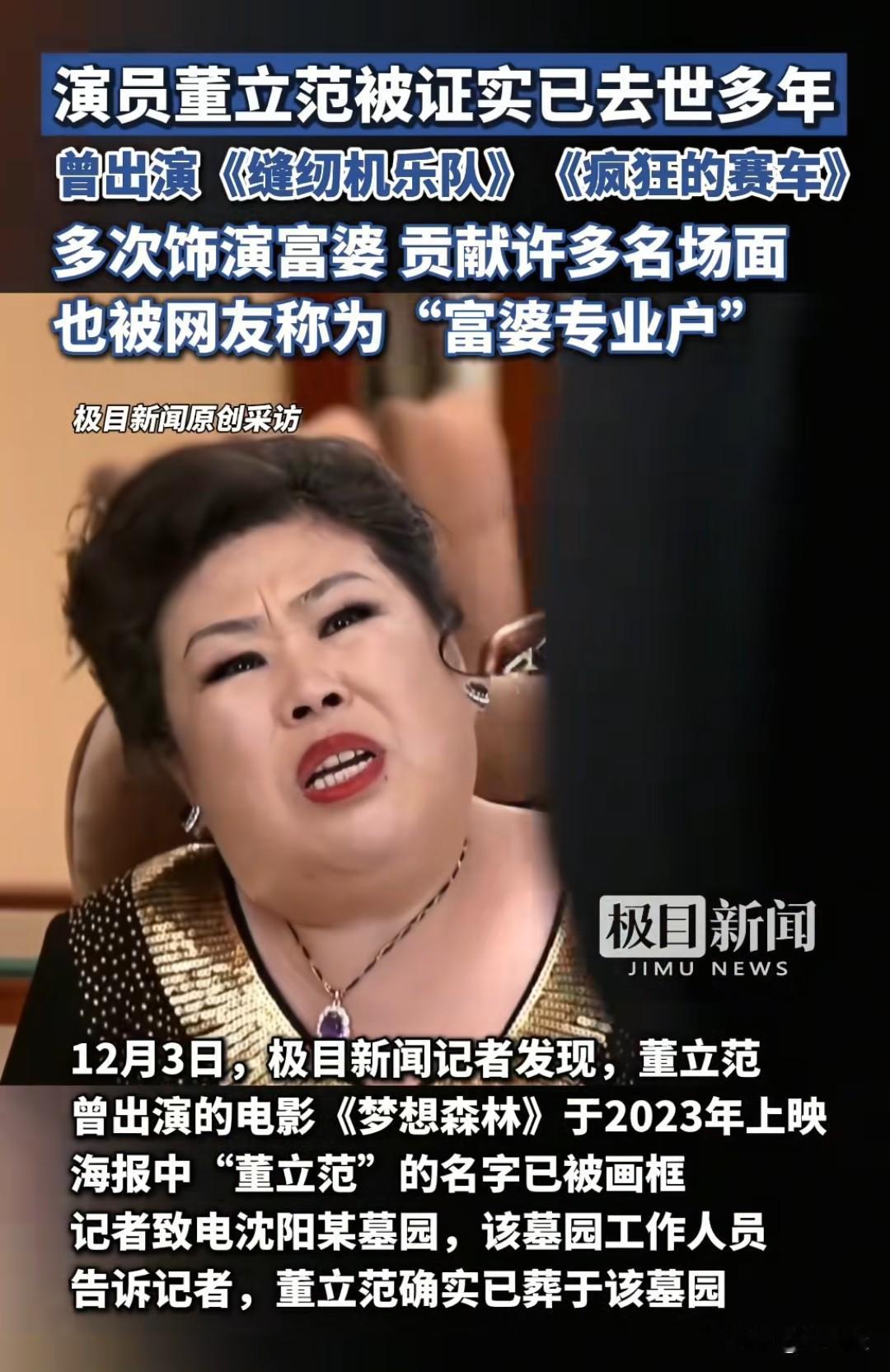 “富婆专业户”董立范,原来已经走了好几年了! 就是《疯狂的赛车》里那泼辣肥婆、《缝纫机乐队》里的霸气大姐,一挑眉自带笑点的演员。最近《梦想森林》海报上她名字被加了框,墓园也证实了消息——这位演了一辈子“狠角色”的配角,早悄悄埋在了沈阳。 她演的富婆又横又好笑,一出场就是名场面,没想到戏外连离世都这么低调。那些鲜活的镜头,算是给观众留的念想了。
