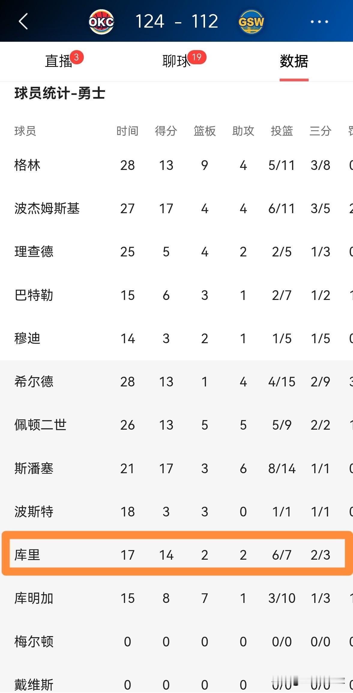 勇士新援塞斯-库里真是球队的完美补充!虽然今天勇士在主场以112:124不敌雷霆,但是小库里却收获了一场堪称完美的首秀。 整场比赛下来,小库里替补出战17分钟,投篮7中6,其中三分球3中2得到14分2篮板2助攻1抢断,他的场上正负值为-2。 实事求是的说,小库里的投篮稳定性真的要强于库里,这下勇士球迷可以暂时忘记库里了。