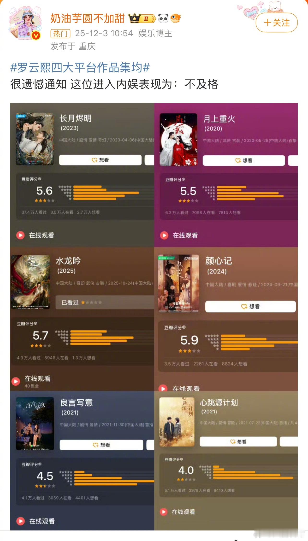 热门里说好的和说差的都有罗云熙四大平台作品集均