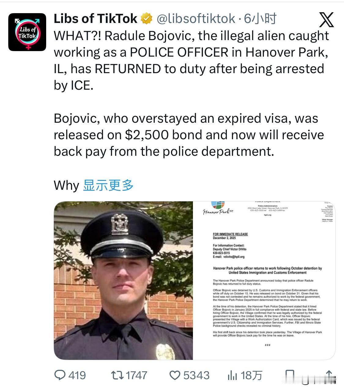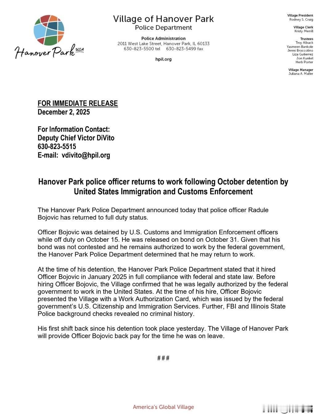 2025年10月15日,美国移民及海关执法局(ICE)逮捕了25岁的拉杜勒·博约维奇(Radule Bojovic)。国土安全部(DHS)称,博约维奇是黑山公民,于2005年持旅游签证入境,但签证于2015年3月31日到期后一直非法滞留美国,已逾期居留十年 汉诺威公园村(Village of Hanover Park)和警察局坚称,博约维奇在2025年1月被录用时,提供了有效的由美国公民及移民服务局(USCIS)颁发的工作授权卡,并且通过了包括FBI和伊利诺伊州警在内的全面背景调查,没有犯罪记录。村政府表示,如果他没有合法的联邦工作授权,就不会被录用。 在被拘留两周后,博约维奇于2025年10月31日获得移民法官设定的2500美元的低额保释金后获释。他目前处于行政休假状态。村政府表示,如果他的移民身份允许他继续留在美国并合法工作,他将被恢复全职警官职务。 此案引发了关于美国移民体系漏洞以及伊利诺伊州“庇护州”政策的广泛争议。国土安全部官员批评伊利诺伊州的政策,并指出非法移民拥有枪支是重罪,质疑他作为执法人员的合法性。然而,村政府和一些法律专家指出,博约维奇持有联邦政府签发的工作许可,且被捕时法官设定的低保释金表明他未被视为社区危险或有潜逃风险。 简而言之,拉杜勒·博约维奇(Radule Bojovic)目前处于带薪休假状态,能否最终重返工作岗位,将取决于他尚未结束的移民案件的判决结果。