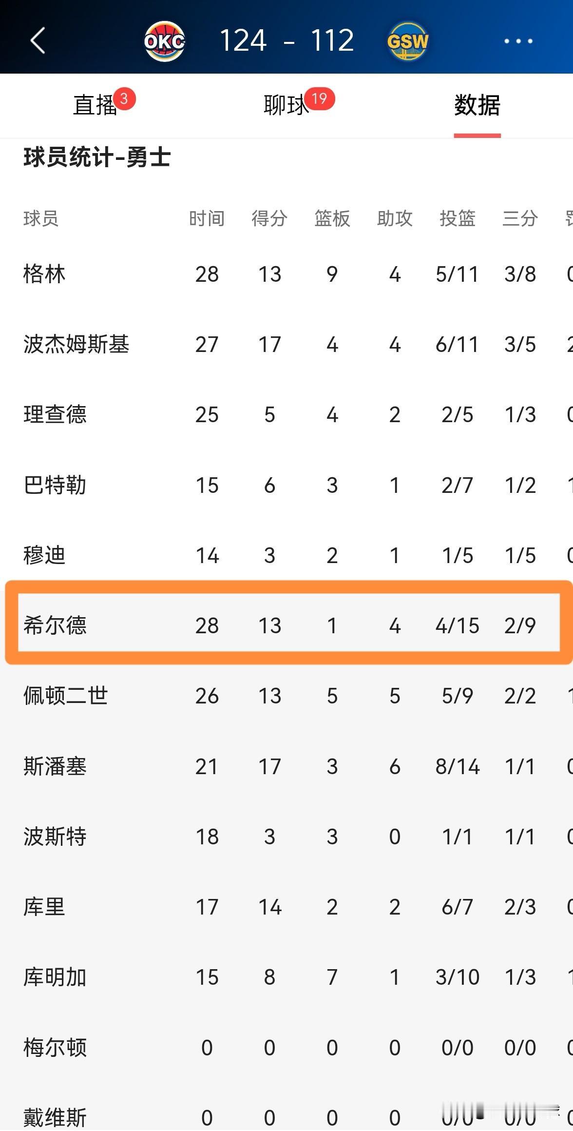 勇士大将希尔德真是烂泥扶不上墙!在今天勇士主场以112:124不敌雷霆的比赛中,希尔德又一次打出了非常低迷的表现。 整场比赛下来,希尔德替补出战28分钟,投篮15中4,其中三分球9中2、罚球3中3得到13分,他的场上正负值为-12。 不出意外的话,希尔德在勇士的地位将会被小库里取代,毕竟希尔德的投射能力远远不如小库里,本场比赛小库里仅有7次出手就砍下14分。