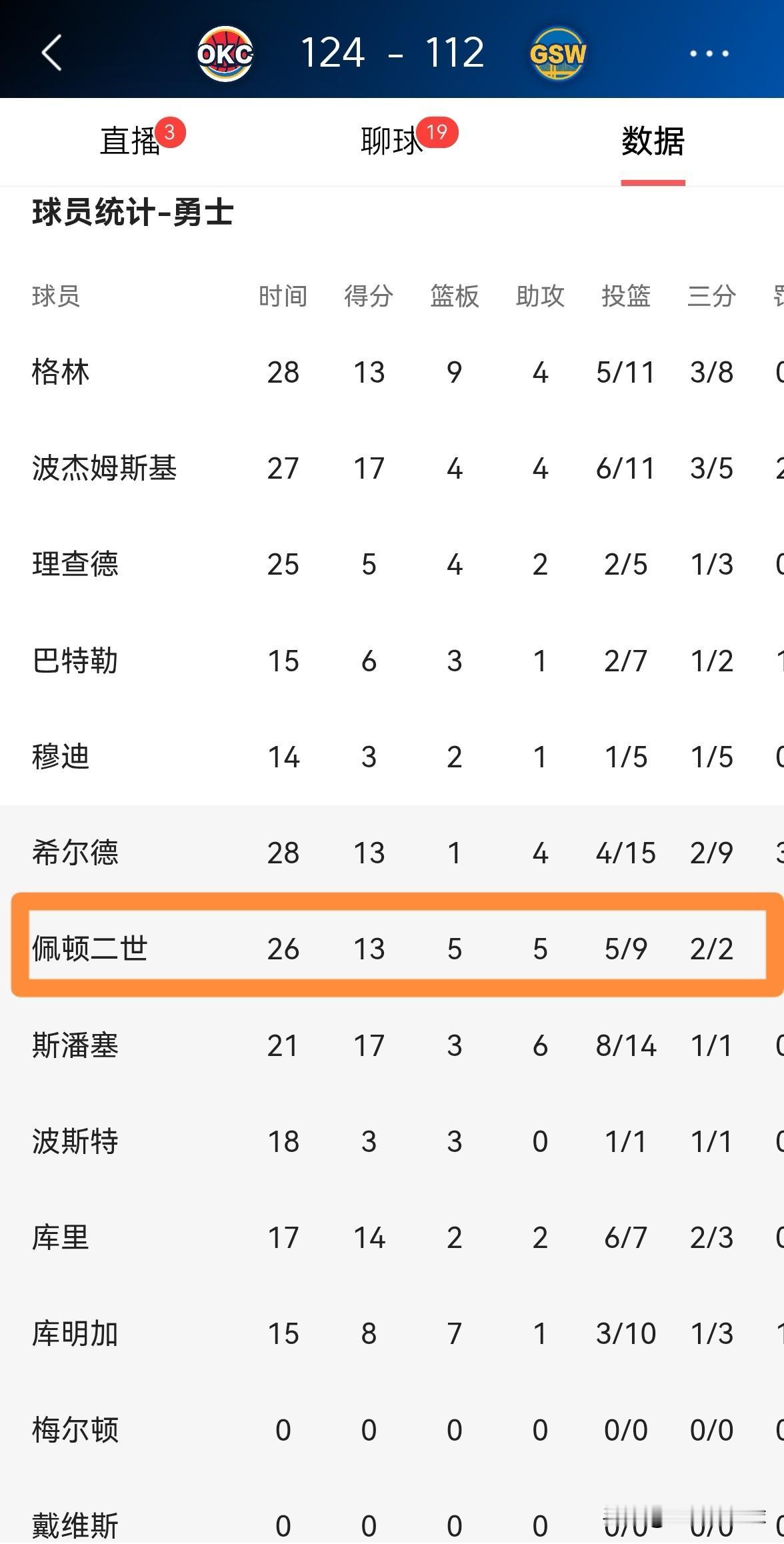 勇士大将小佩顿真是便宜又好用!尽管今天勇士在主场以112:124不敌雷霆,但是小佩顿却在攻防两端都打出了无可挑剔的表现。全场比赛下来,小佩顿替补出战26分钟,投篮9中5,其中三分球2中2得到13分5篮板5助攻。 毫不夸张的说,以小佩顿在本场比赛中的表现来看,他绝对配得上一份平均年薪为1500万美元的合同。