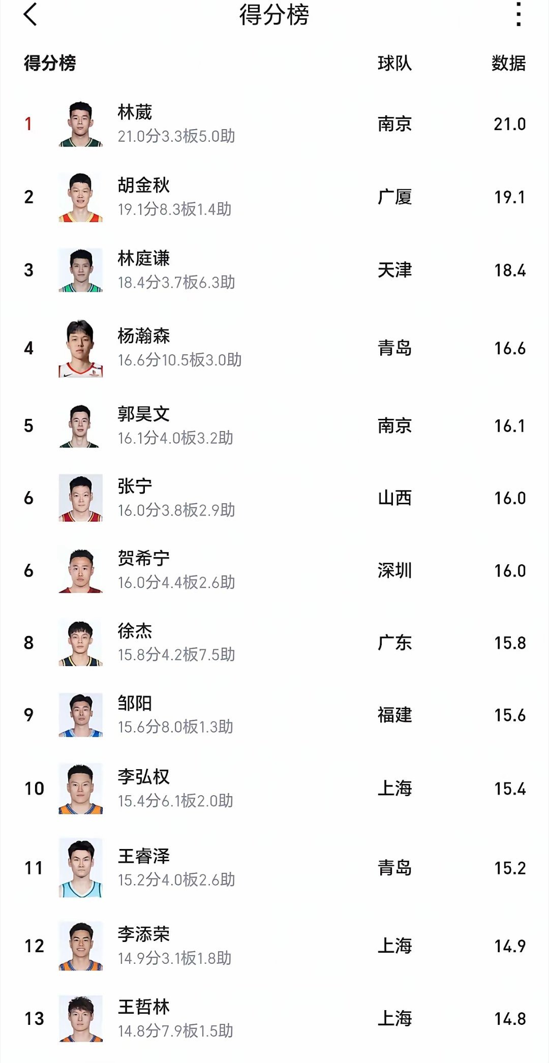中国男篮打韩国真给我看笑了2024-2025赛季CBA常规赛国内球员得分榜前14