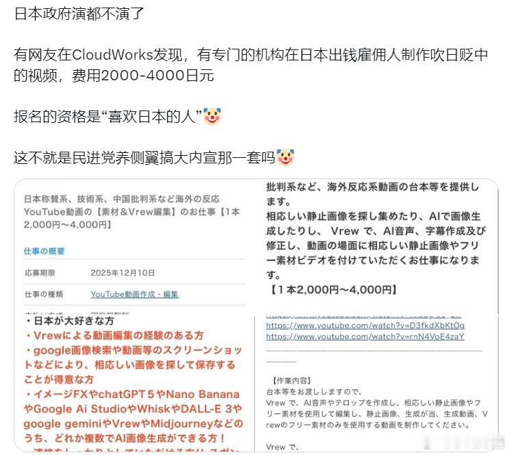 据X博主:有网友在CloudWorks发现,有专门的机构在日本出钱雇佣人制作吹日贬中的视频,费用2000-4000日元。中日战争不是开玩笑黄媒不会说的真相