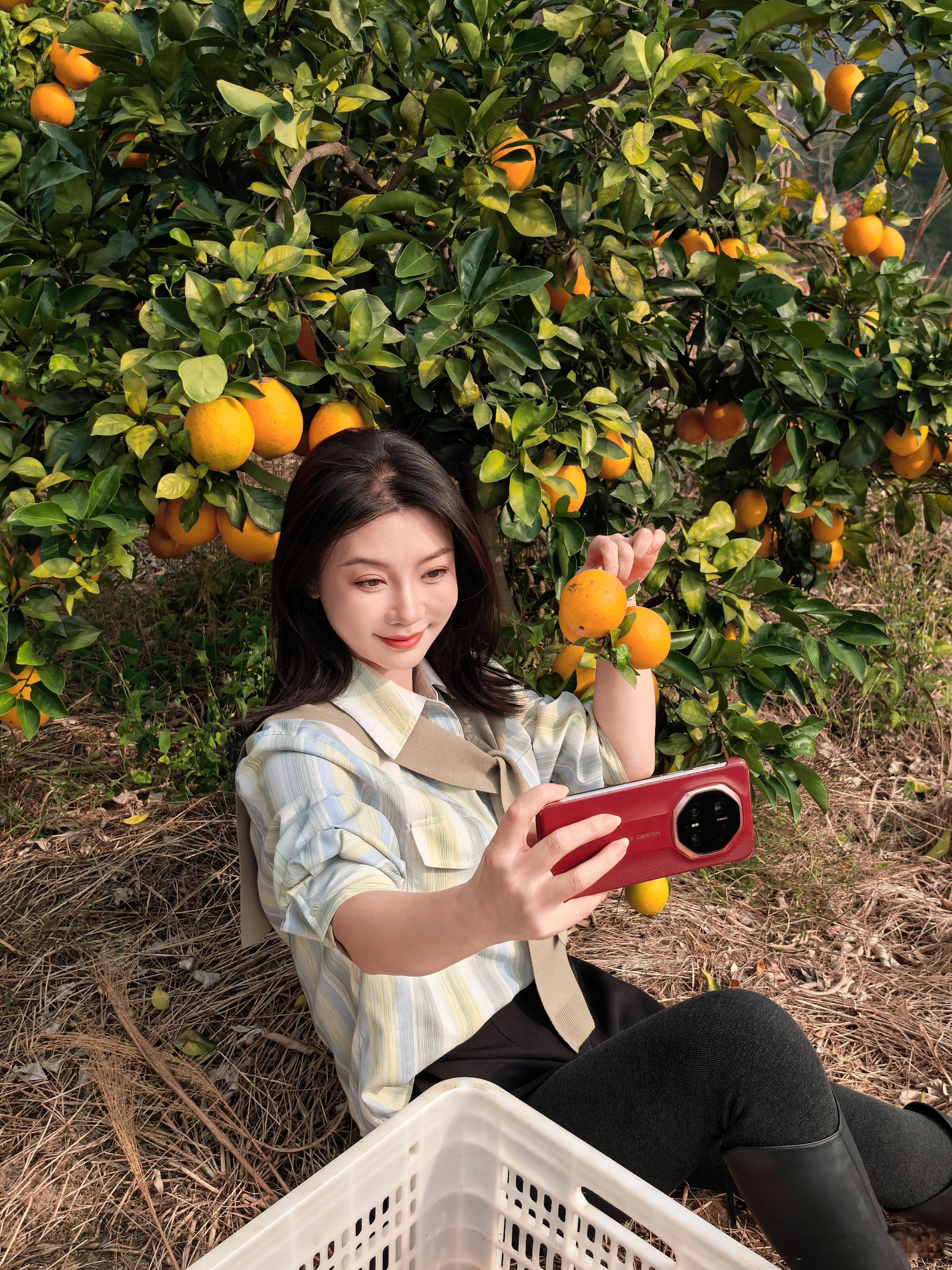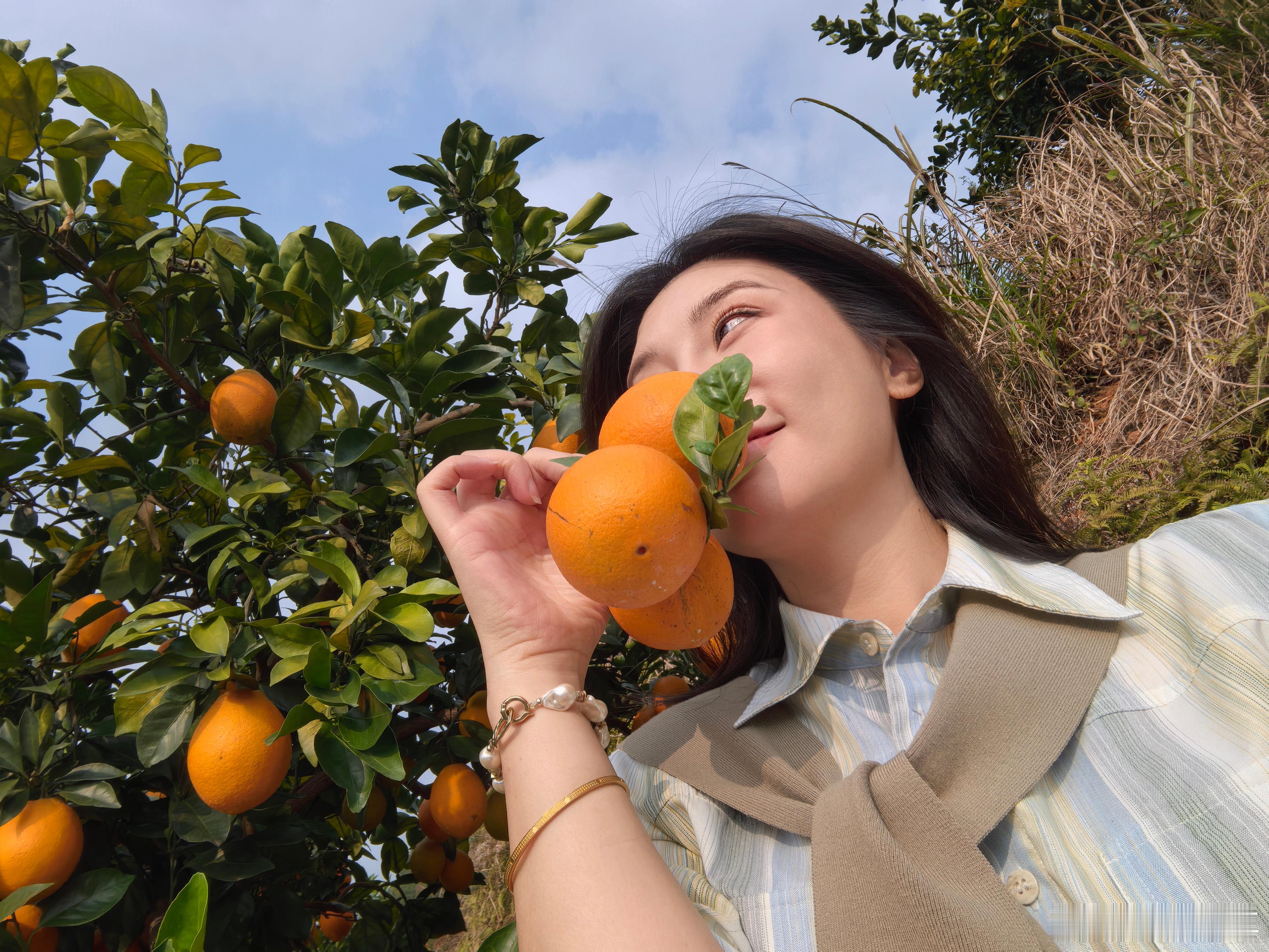 开蔚来ET5T绕了几段弯弯绕绕的路才到橙子园,刚下车就摘上了橙子,剥开来一尝,超