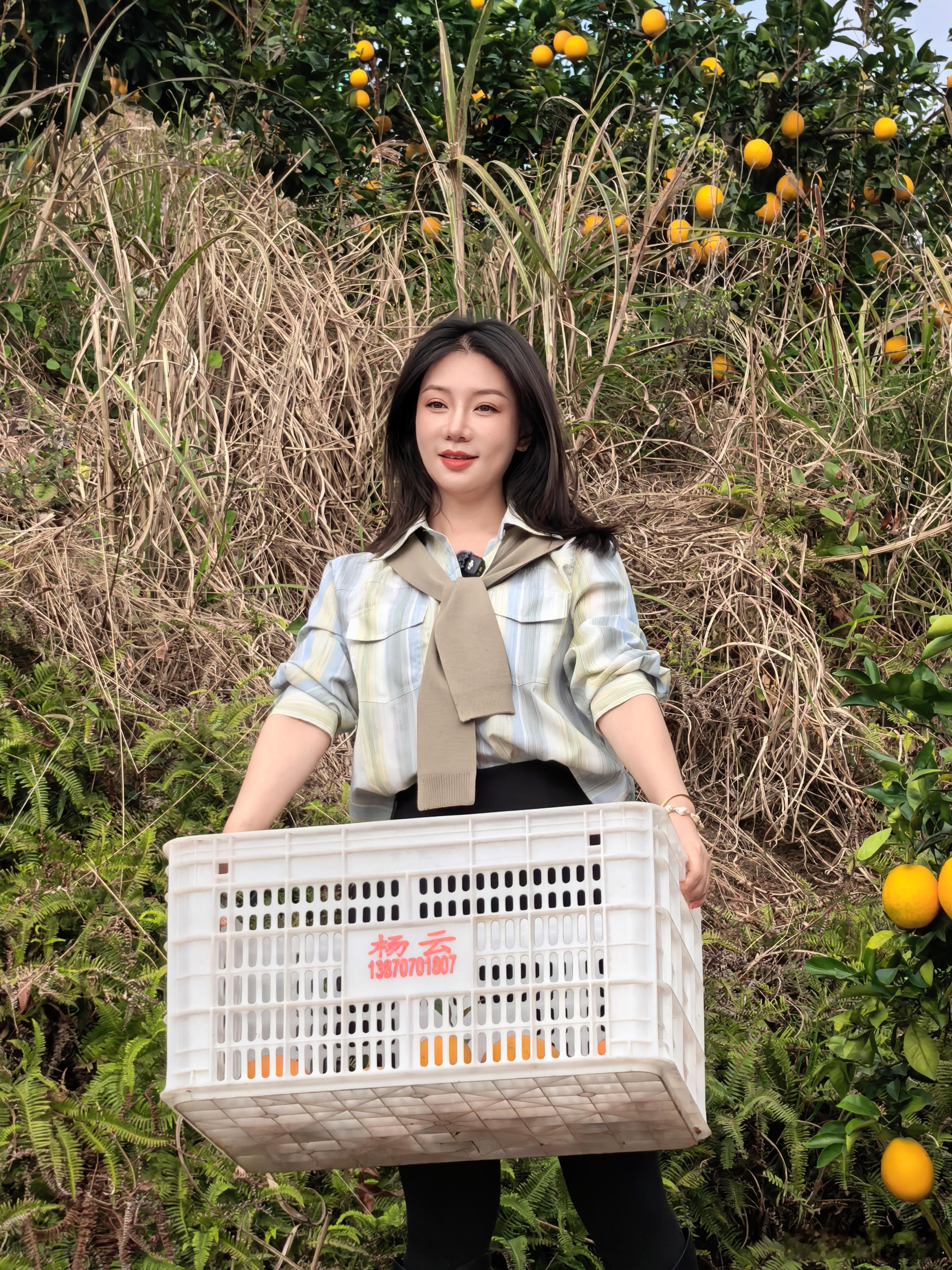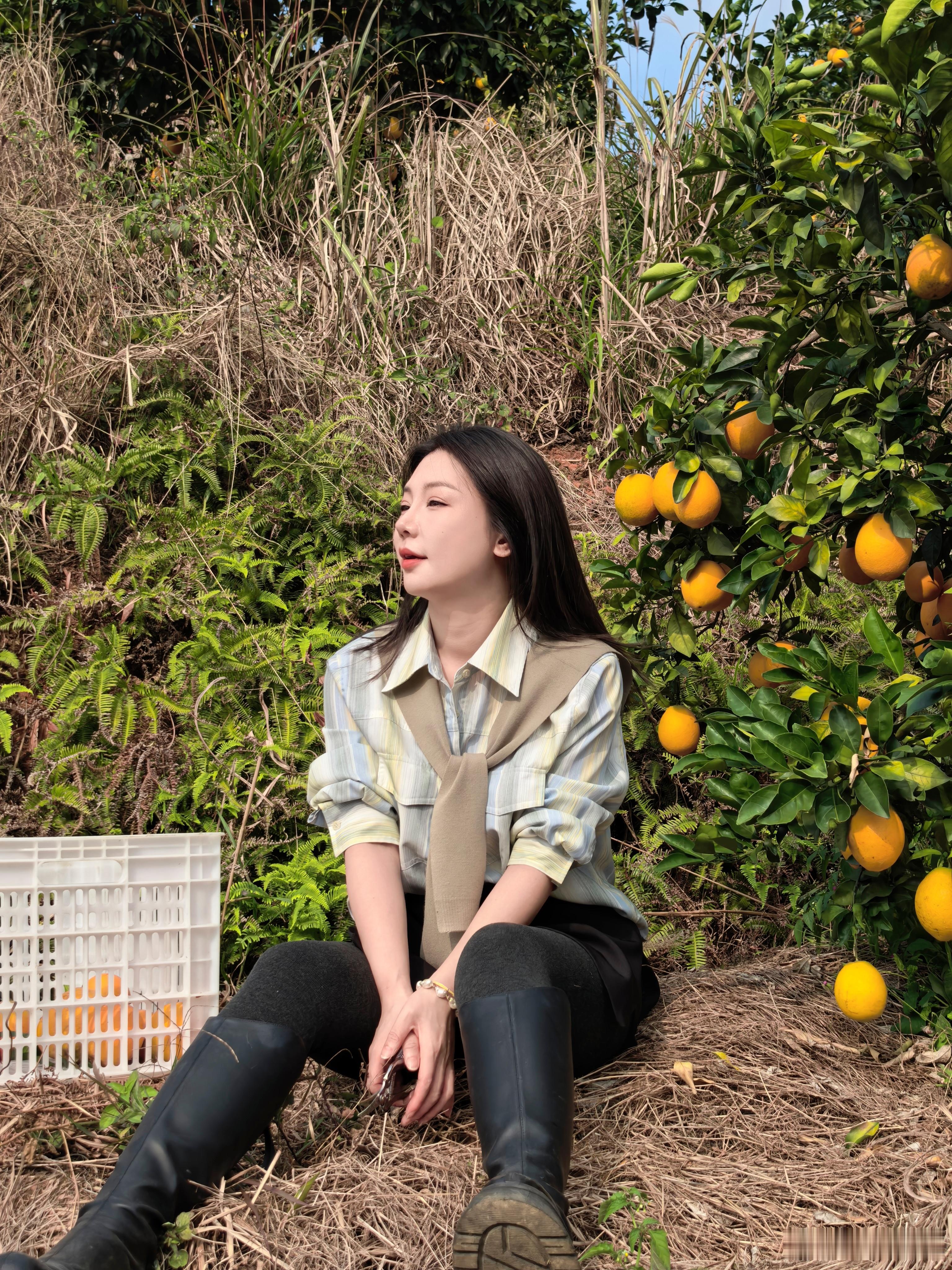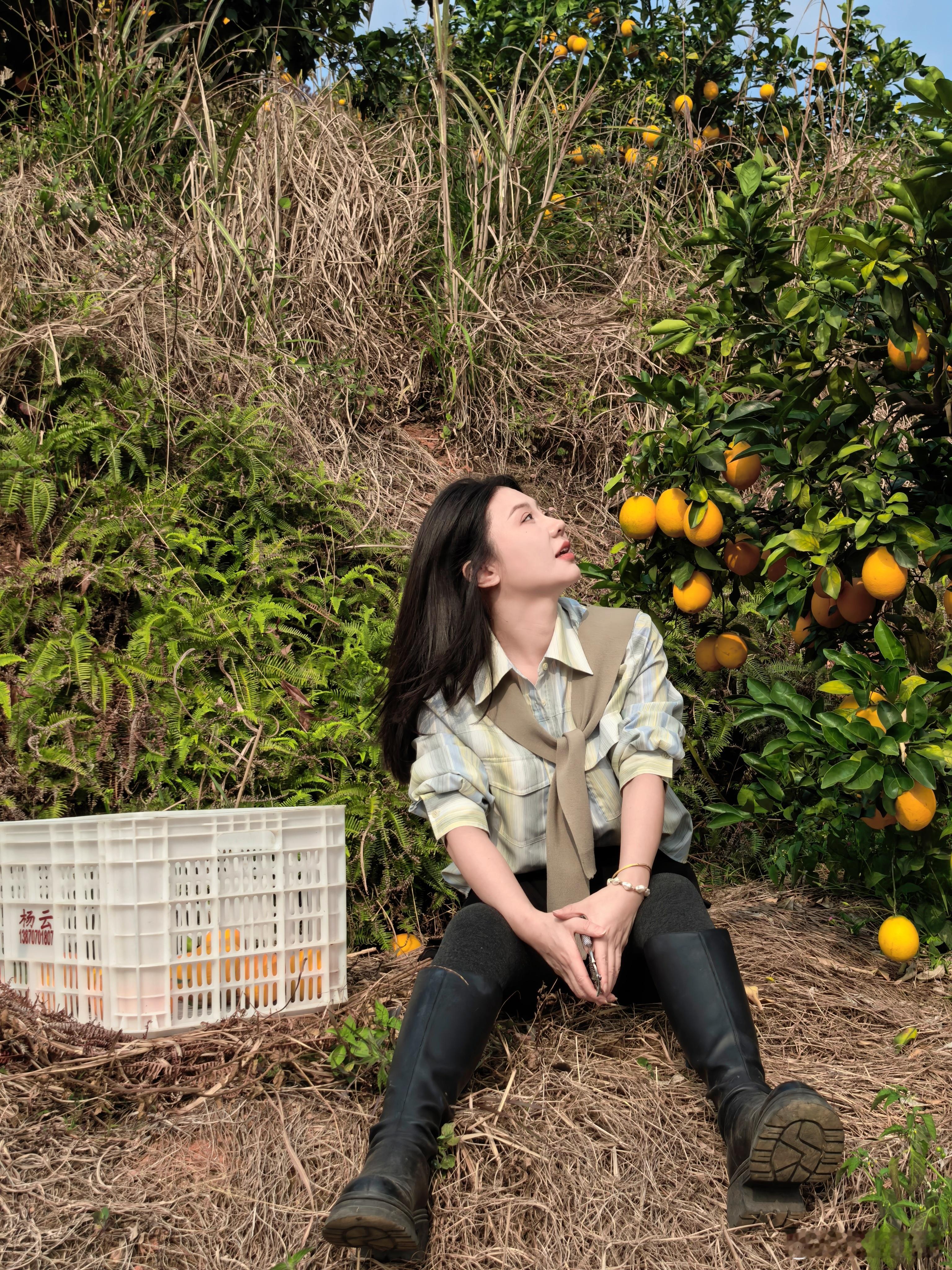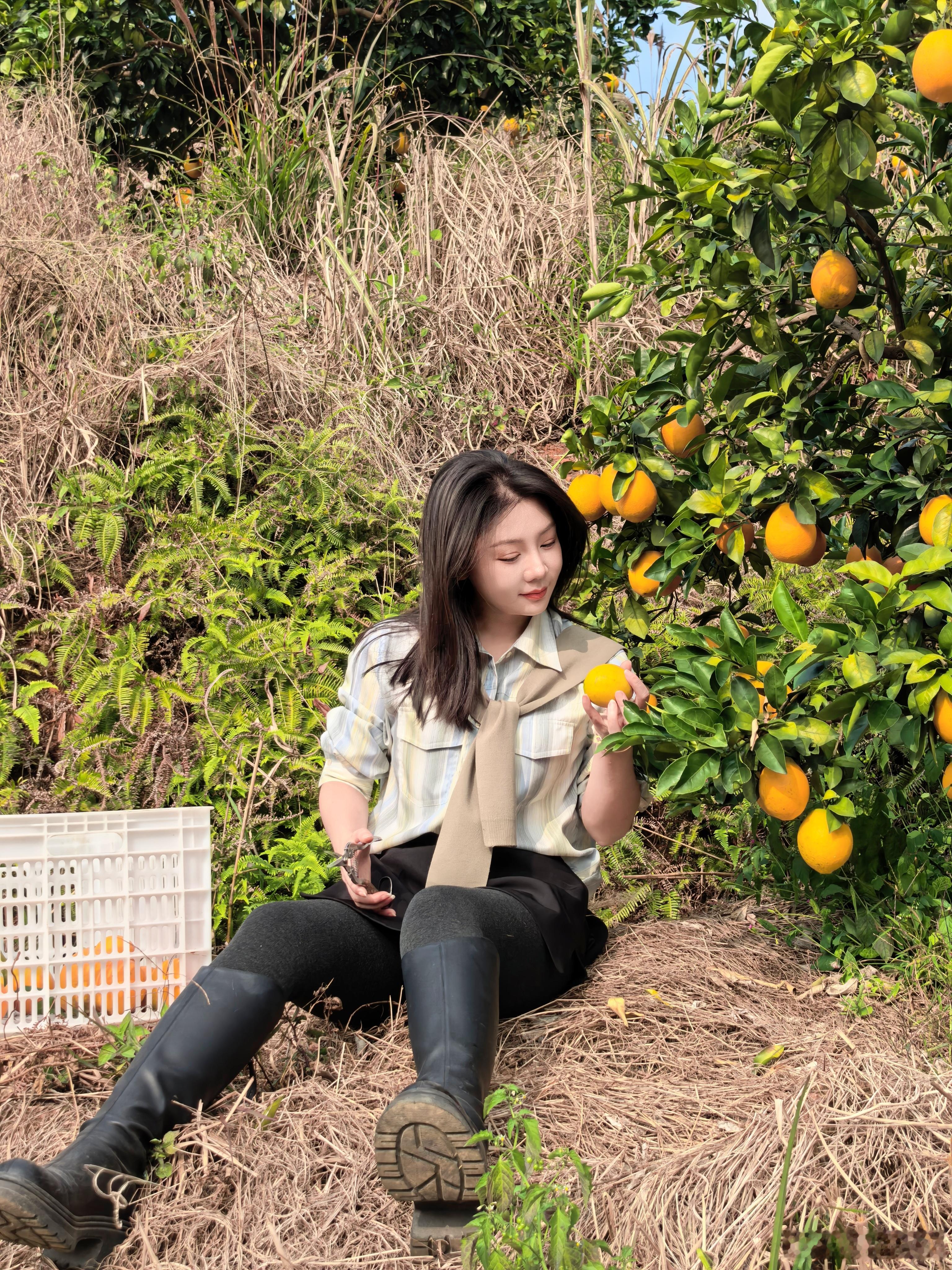 摘了小半天橙子,腿有点酸,找了块空地坐下来歇脚,筐里已经装了小半筐黄澄澄的果子,