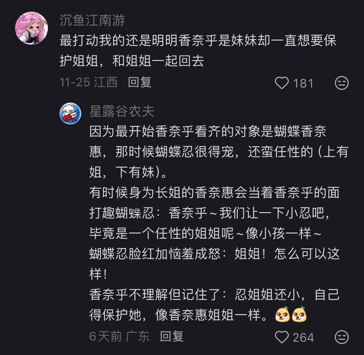鬼灭之刃 “我想守护她的~拼上性命也想守护她,想与她一同回家的”我们蝶屋姐妹的情感真的很震撼又细腻香奈乎是妹妹,但是因为初遇时忍是妹妹的角色,是被香奈惠宠爱的妹妹,所以香奈乎一直就想像香奈惠一样保护她