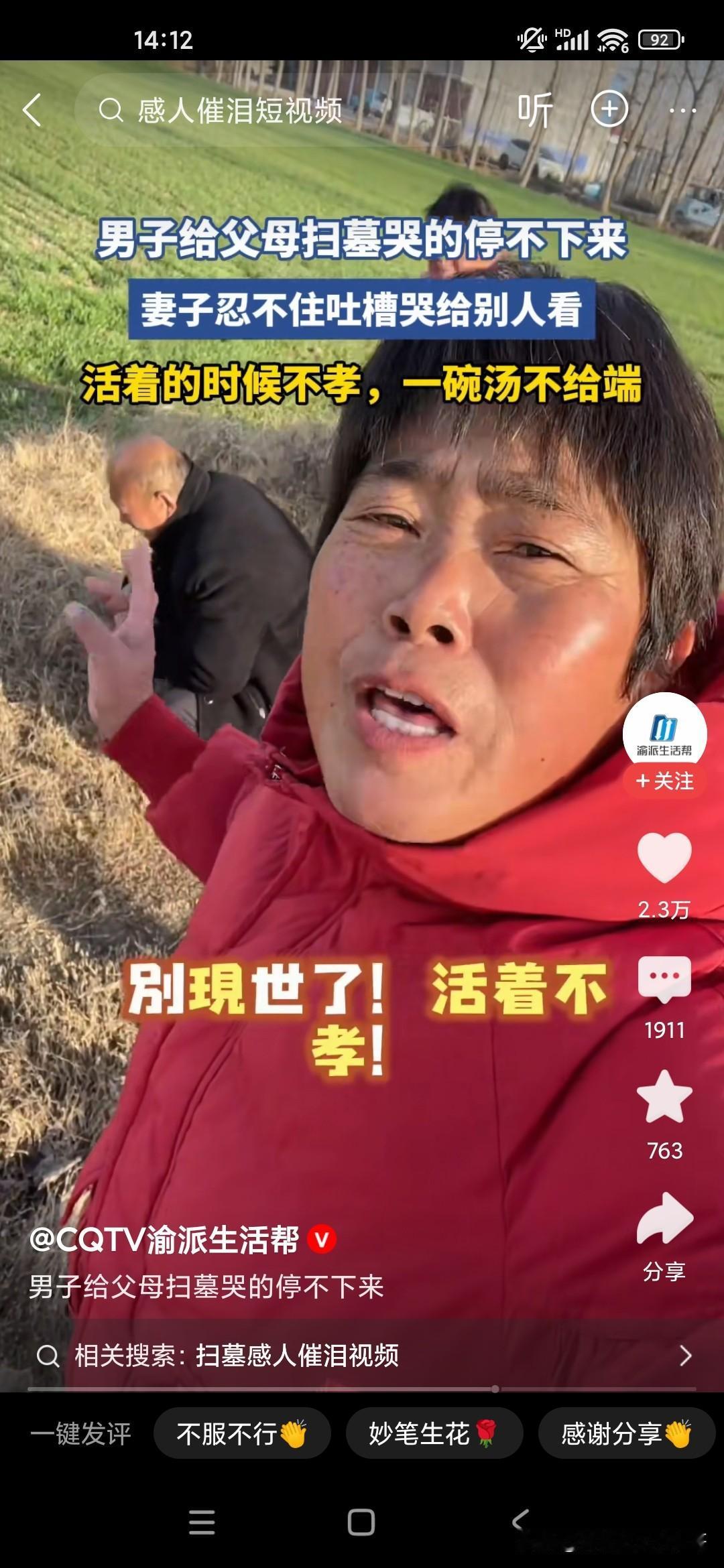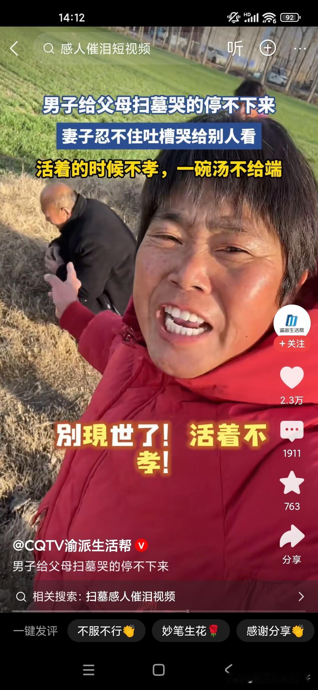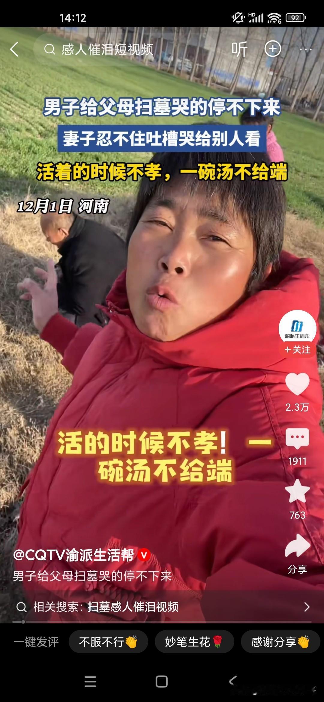 这位大姨数落她的老公在12月份上坟的时候,说她老公哭的像狗一样,像驴一样,非常伤心。也许她老公良心的发现在生前没有好好孝顺他的母亲,现在的确是后悔了,但是已经阴阳两隔了,他媳妇可能也知道她老公对她娘做了什么,他母亲活着的时候连一碗水,一碗汤都不愿意给他父母端,现在的话母亲早已经去世了,他现在想行孝也没有机会了,可能他内心从良心上反省了,自己觉得这样实在是对不起父母,感觉自己坏了良心,所以说哭的很伤心,但他媳妇儿一点都没有留情,在旁边拍了视频,而且狠狠的嘲讽他,这其实给所有的年轻人也有一种启示:那就是趁着父母活着的时候,好好孝顺自己的父母,不要给自己留太多的遗憾!
