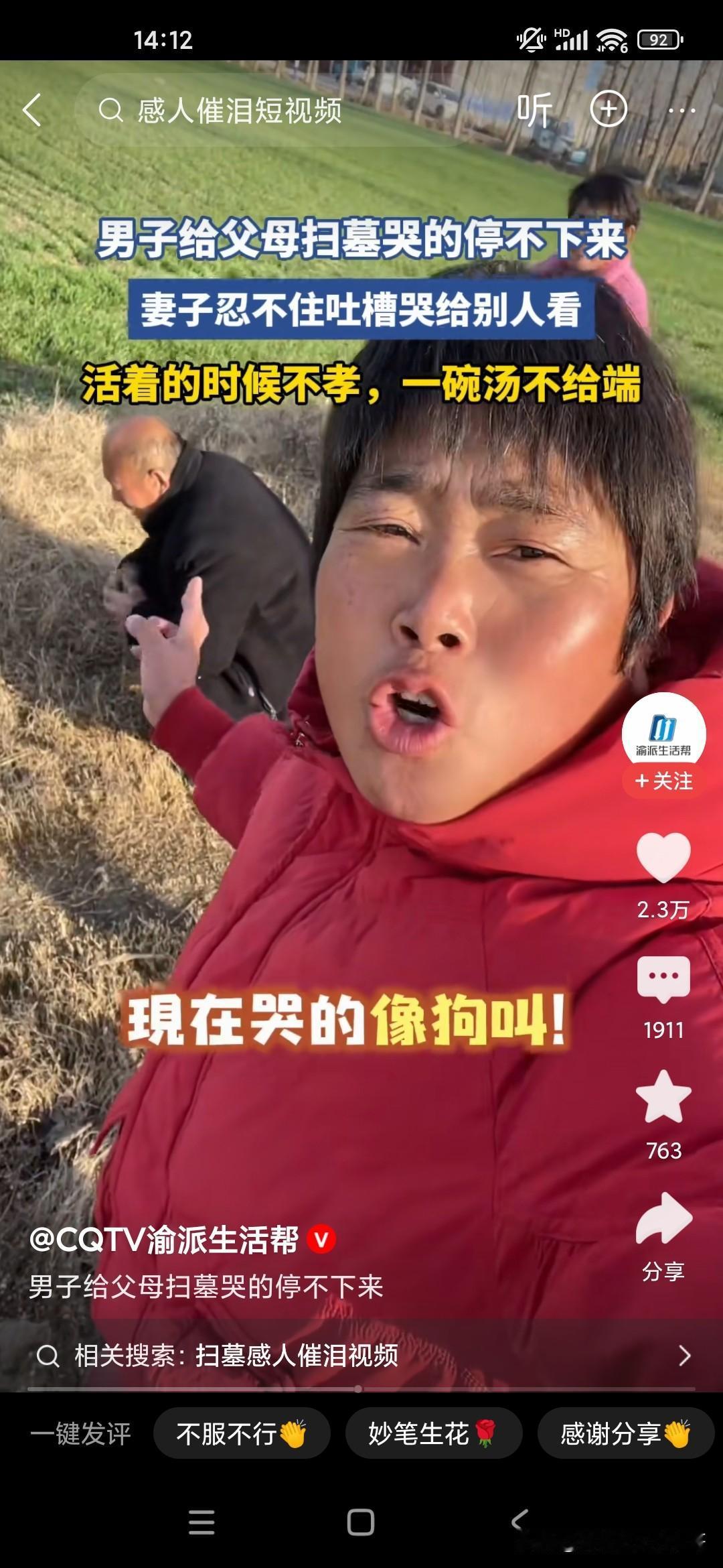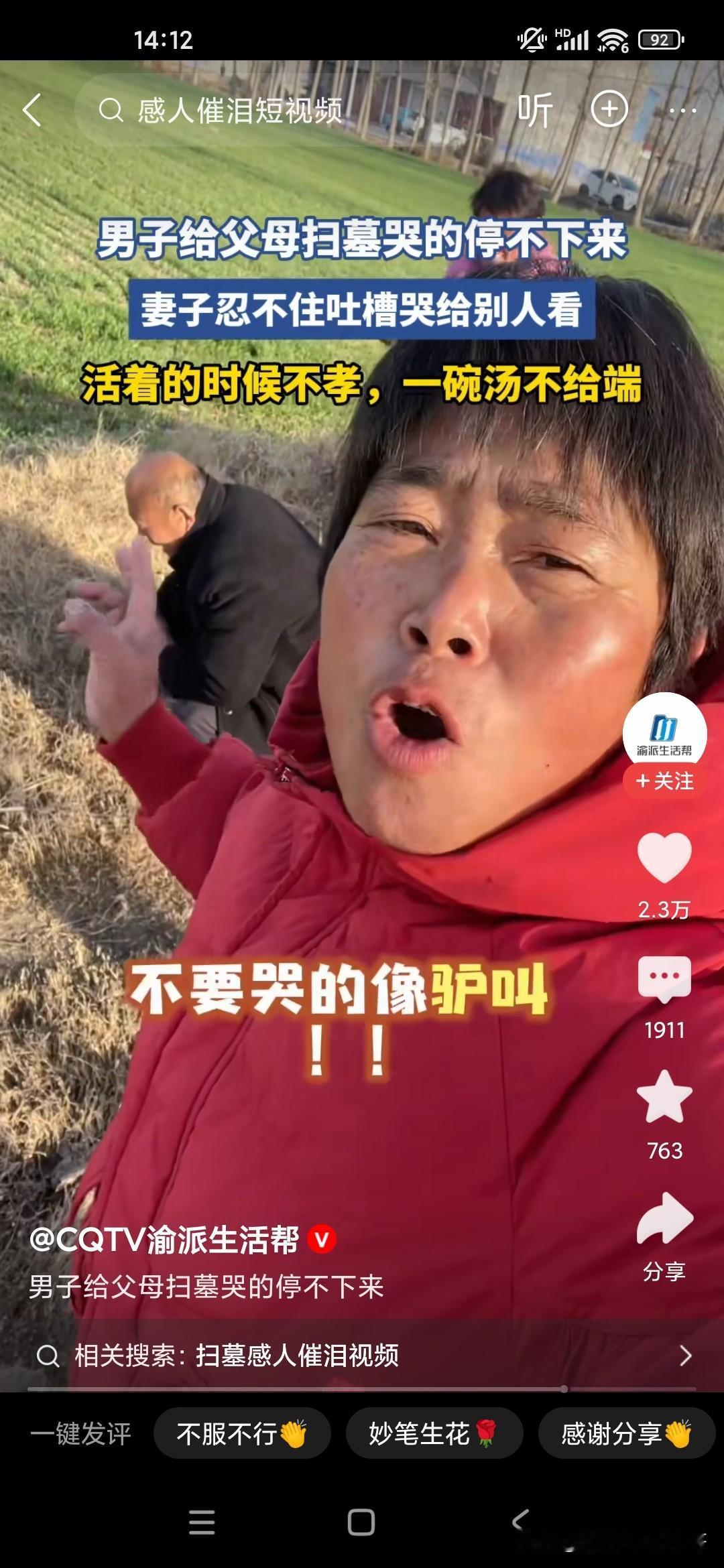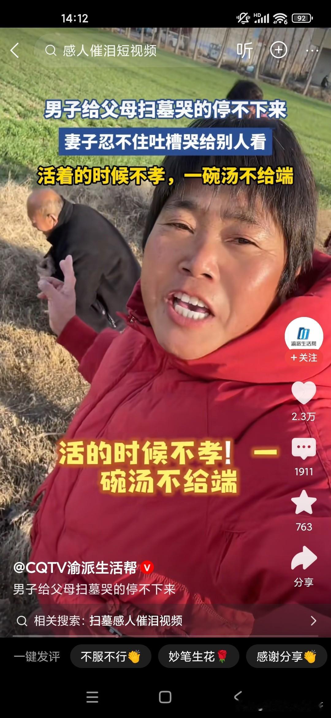 这位大姨数落她的老公在12月份上坟的时候,说她老公哭的像狗一样,像驴一样,非常伤心。也许她老公良心的发现在生前没有好好孝顺他的母亲,现在的确是后悔了,但是已经阴阳两隔了,他媳妇可能也知道她老公对她娘做了什么,他母亲活着的时候连一碗水,一碗汤都不愿意给他父母端,现在的话母亲早已经去世了,他现在想行孝也没有机会了,可能他内心从良心上反省了,自己觉得这样实在是对不起父母,感觉自己坏了良心,所以说哭的很伤心,但他媳妇儿一点都没有留情,在旁边拍了视频,而且狠狠的嘲讽他,这其实给所有的年轻人也有一种启示:那就是趁着父母活着的时候,好好孝顺自己的父母,不要给自己留太多的遗憾!