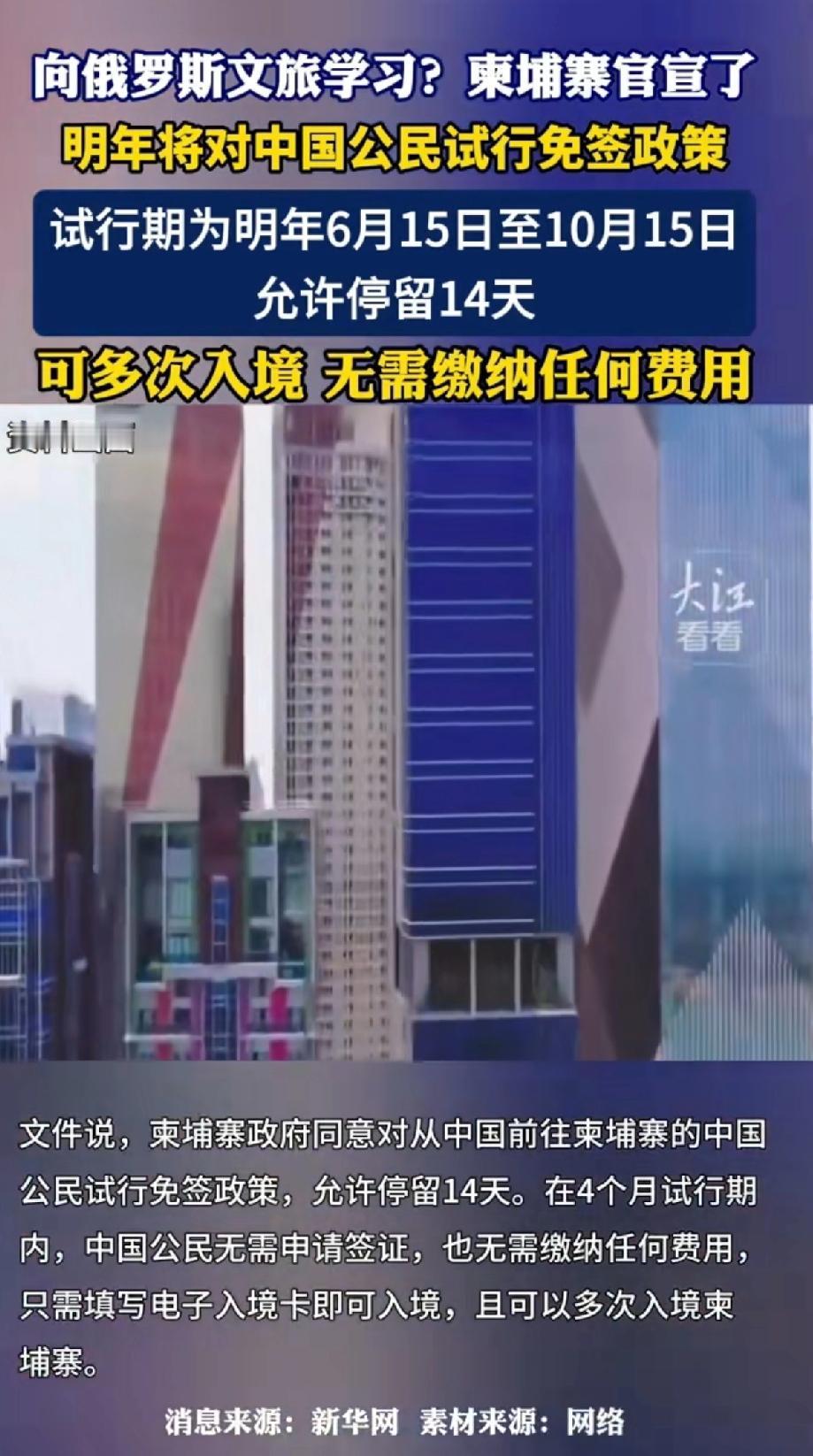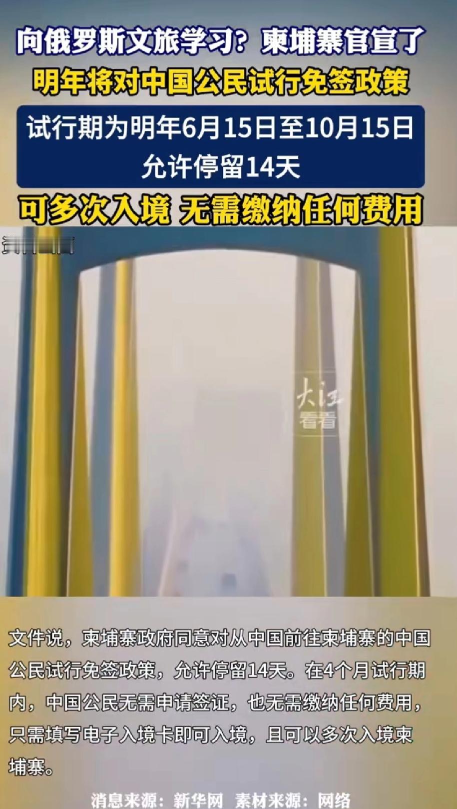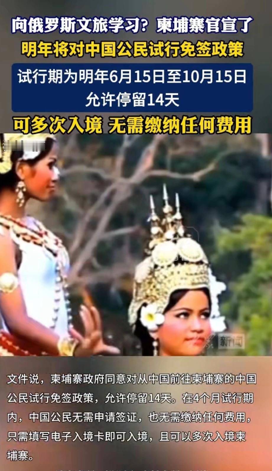柬埔寨向俄罗斯学习!柬埔寨官宣明年将对中国公民实行免签政策。 官宣明年6月15日到10月15日对中国公民试行免签,一次能停留14天,还能多次入境,只需填个电子入境卡,连签证申请和费用都省了。 看来是向俄罗斯学习,知道吸引中国游客的重要性。 今年1 - 10月柬埔寨就吸引了约100万中国游客,这免签政策一出,估计明年去柬埔寨旅游的国人会更多。 这100万国人真大胆,俄罗斯对我们免签,韩国也对我们免签,现在柬埔寨也学着免签。 韩国人再讨厌,也就鄙视游客。去俄罗斯旅游,就是受冻,或者被抢,最起码生命安全能得到保障。 去“柬埔寨”旅游,不是行走的人民币吗?就怕他们掏心掏肺的对待呀[捂脸][捂脸] 牛魔王去了都要犁地,孙悟空去了都要表演马戏。 我一介凡人去“柬埔寨”旅游,真搞笑!我是嫌自己命太长了吗[笑哭][笑哭][笑哭]