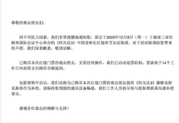 阿凡达3取消中国首映红毯环节,有观点认为与香港大火有关,但这一说法并未得到证实。 官方也只是说不可抗力。 至于已经购买本次红毯门票的观众朋友,官方已经启动了退票机制。在电影开启预售后,这部分观众还能得到兑换券,这也算是一种补偿了。至于观众自己酒店、交通的花销,官方自然是不会负责的。 电影的上映计划不变,中国与北美仍同步定档12月19日公映,片长195分钟创系列之最。卡梅隆称此为“系列最感人一部”,后续《阿凡达4》《阿凡达5》暂定2029、2031年上映。 只是电影是否能如卡梅隆自己所评价那样,这就需要观众们点评,而不是他自己一个人说了算。 在经历过《阿凡达2》后,个人对于第三部期待值不是很高,更多是一种鸡肋的感觉。 希望电影上映后,能够打破这种感觉,毕竟好的作品,是不缺乏观众的。 阿凡达3取消中国首映红毯环节阿凡达3致歉