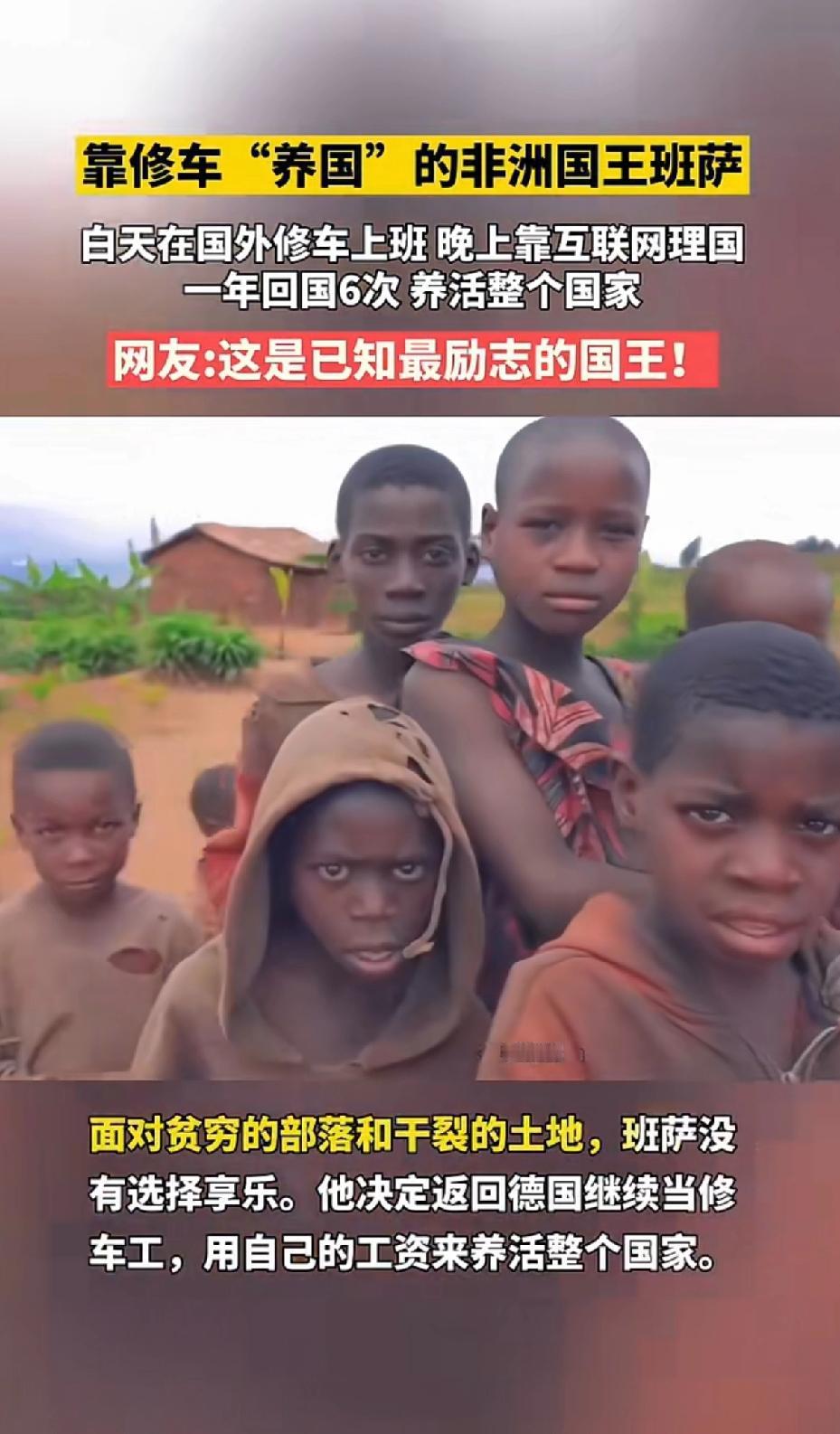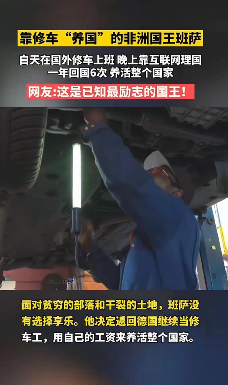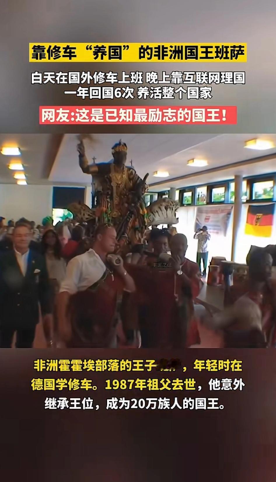 靠修车“养国”的非洲国王班萨,便塞法斯·班萨,这位堪称传奇的非洲“国王”,经历十分奇妙。 他白天上班修车,晚上靠互联网治理国家,一年回国6次 养活整个国家。 他出生在加纳霍霍埃部落,部落穷得叮当响,爷爷虽是酋长,还是把他送去德国技校学车辆机械。毕业后,班萨在德国小镇开了家汽修厂,本以为日子就这么过了。 17年后,爷爷去世,他被召回部落。因部落规定左撇子不能当酋长,父亲和哥哥都“躺枪”,班萨稀里糊涂成了新酋长。 看来他们的政治很光明,皇位接替没有流血事件发生,就凭借不是“左撇子”而顺利的坐上国王的宝座。[笑哭][笑哭] 2014年,他报警说家里4顶皇冠等皇室用品被盗,警察起初以为是假警。 原来这些皇冠和纯金冕服价值约2万欧元。班萨自爆自己是非洲部落国王,他白天修车,晚上批奏折,靠修车收入建设部落,真可谓“靠修车养国”。