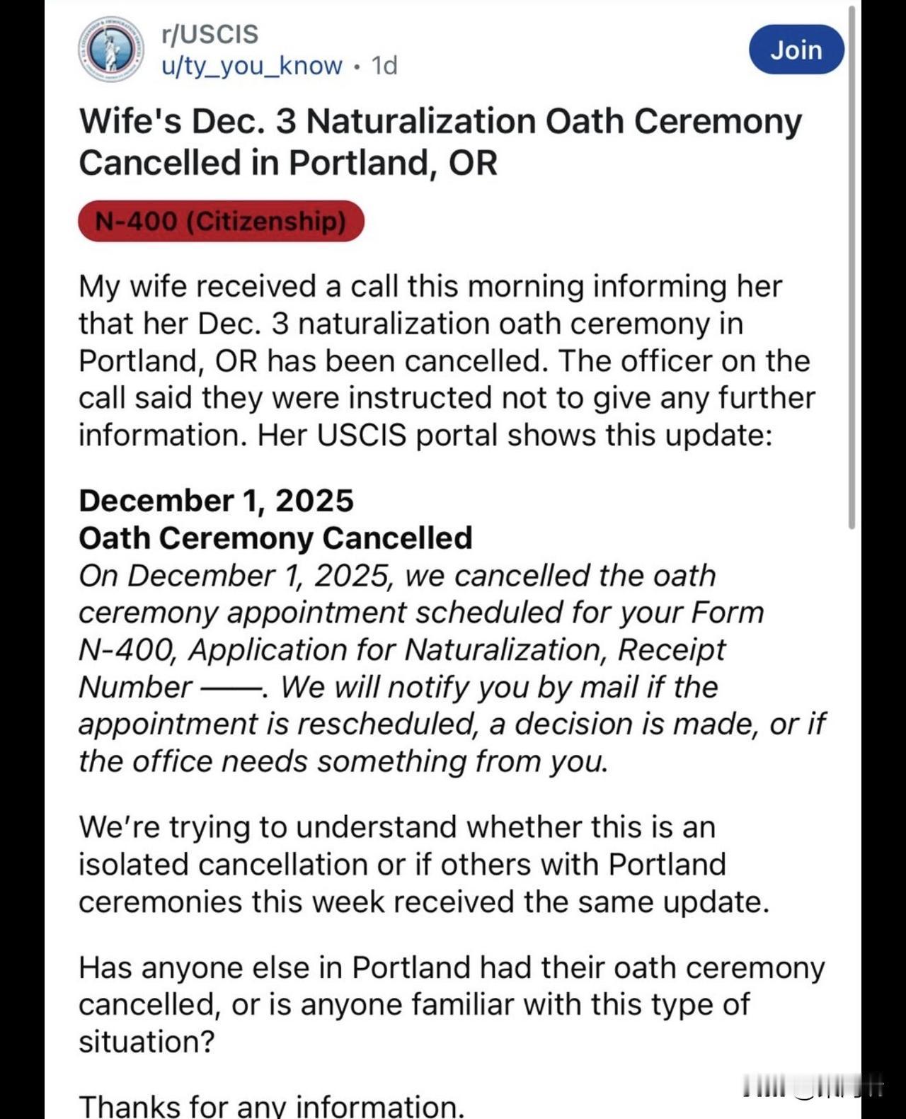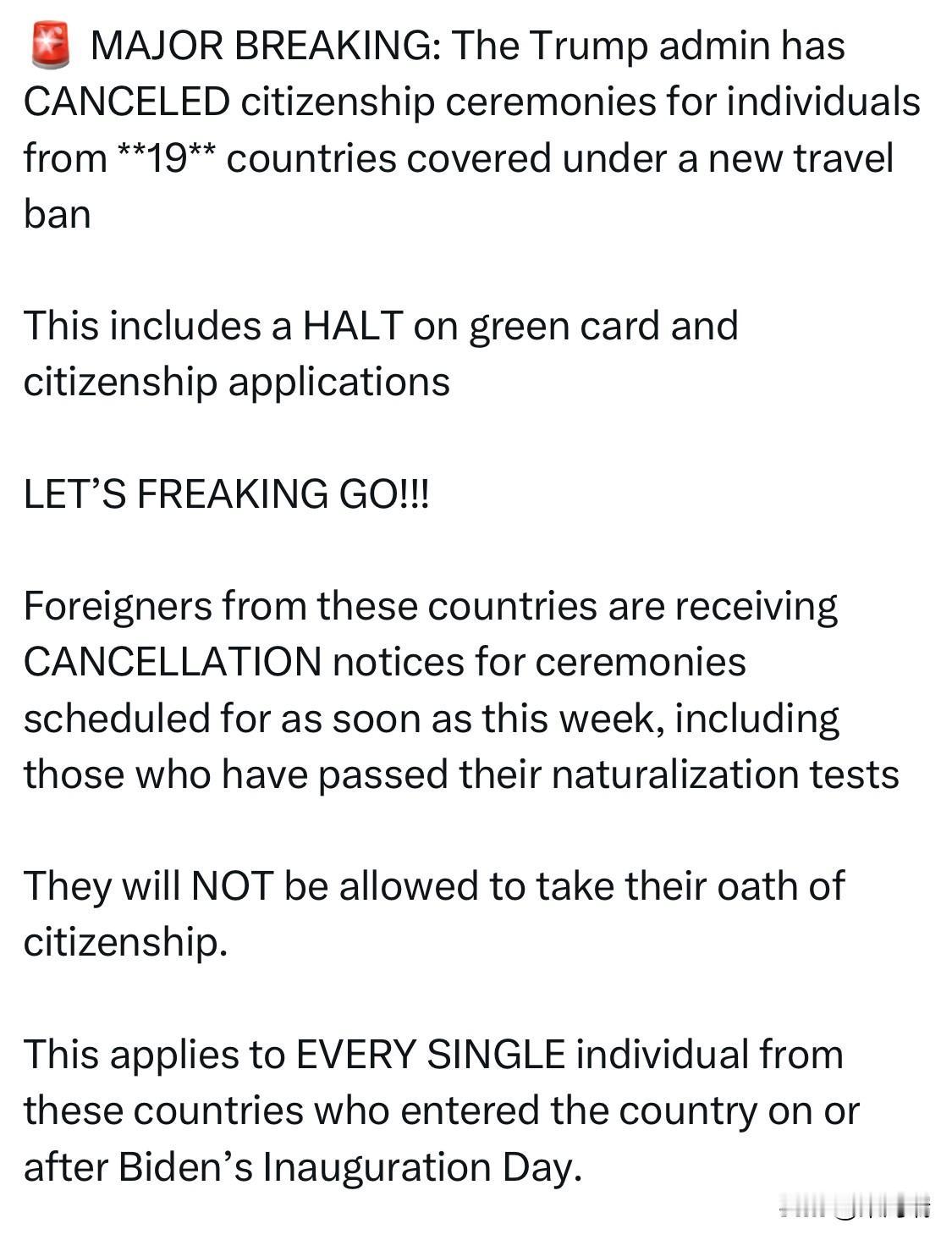 重大突发新闻:特朗普政府取消了来自19个国家的公民入籍仪式,这些国家受到新的旅行禁令的限制。 这包括暂停绿卡和公民身份申请。 来自这些国家的外国人收到了取消通知,原定于本周举行的入籍仪式已被取消,其中包括已经通过入籍考试的人。 他们将不被允许宣誓入籍。 这适用于在拜登就职日当天或之后进入美国的每一个来自这些国家的人。