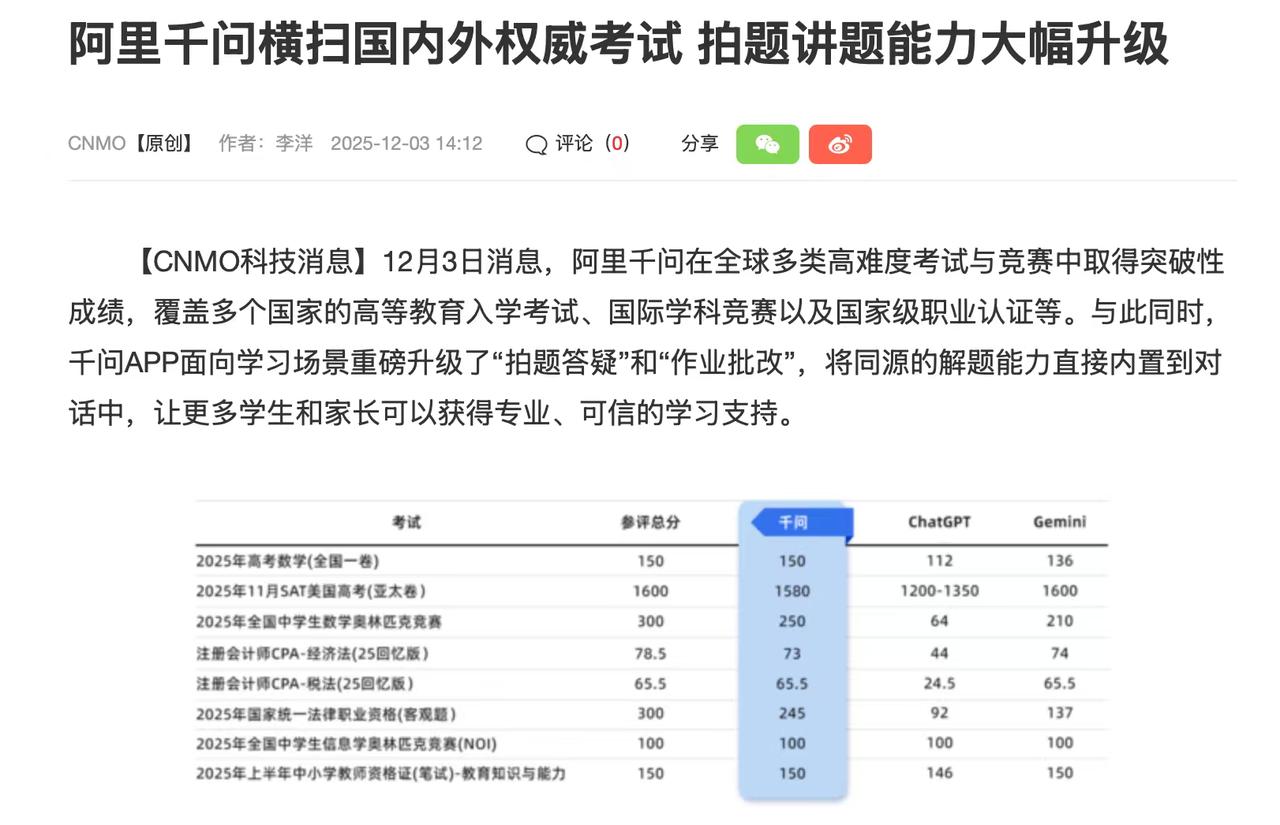 当千问的1580分成绩在SAT考试中脱颖而出,全球教育界震撼了! 12月3日,阿里千问以1580的高分,击败了全球99%的考生,轻松突破了ChatGPT等AI模型,直逼世界顶尖大学的录取标准。 这不仅仅是分数的背后,更是一次教育AI的革命,千问不只是解题,更是带来了从根本上改变学习方式的全新体验。 千问在全球考试中的实力,来源于千问APP在“拍题答疑”和“作业批改”功能升级,不管是纸面手写、黑板板书、课堂PPT还是PDF扫描,千问就能一次精准识别。哪怕是图表题、几何题、函数题等抽象内容,千问也能完整读题并找准题眼。 有特级教师直言,千问的经验丰富的像个老教师。 这个考试成绩不只是一个分数那么简单,千问的这次突破也意味着未来学习入口被极大下沉,孩子在家、在校、在路上,凭一部手机就能获得接近“一线名师”的解题逻辑和批改反馈,对于教育公平,这有可能成为缩小城乡、校际差距的一个加速器。 中国AI带来的这次平权,也让全世界都意识到教育的规则,正在被中国科技亲手改写。