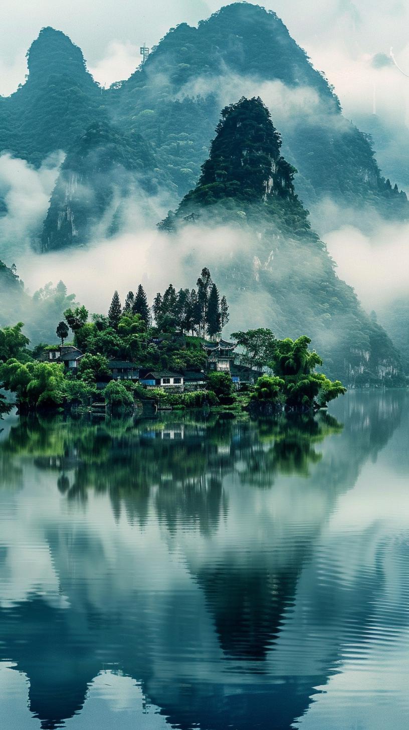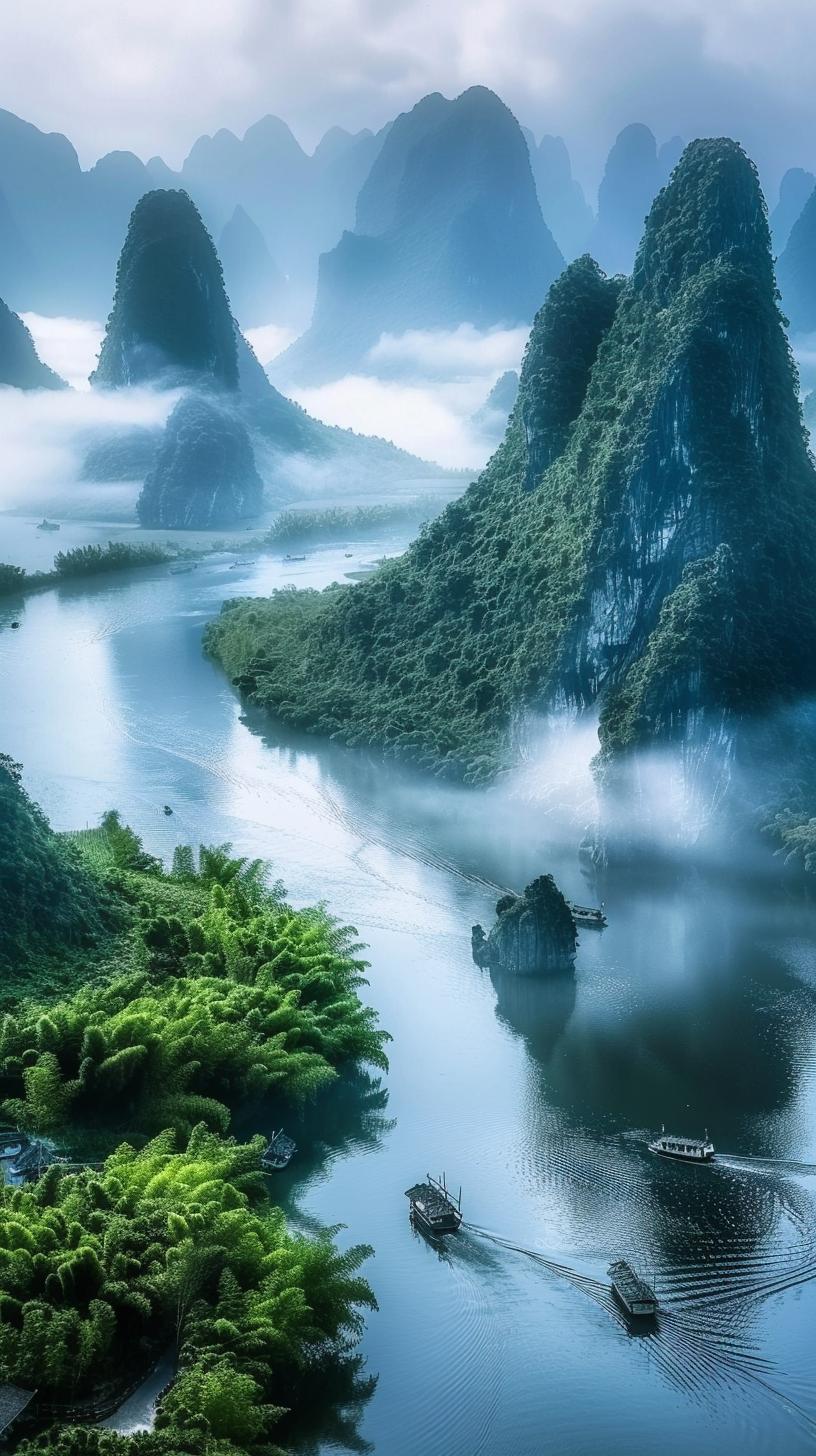 桂林山水甲天下 漓江如练,裁开翠峰千座。孤峰拔地而起,青黛裹着岩骨,云雾在山腰织就轻纱,船行碧波时,连涟漪都染着墨色。 竹筏破开镜水,木船曳着红旌,惊起的浪纹揉碎两岸青峰,连飞鸟都甘愿做这幅画的注脚。晨雾漫过江心,把群峰晕成淡墨剪影,待日色渐明,才显露出崖壁的皴法、竹丛的层次,像宋人笔下的山水活了过来。 更有洲渚浮在波心,白墙黛瓦嵌在绿林里,屋角翘着烟火气,倒影沉在水里,连风都放轻了脚步。 这里从不是画,是山水把日子过成了诗——撑篙人点碎波光,雾气裹着桂香,每一眼都是“江作青罗带,山如碧玉簪”的具象,每一步都踏在水墨的韵脚里。
