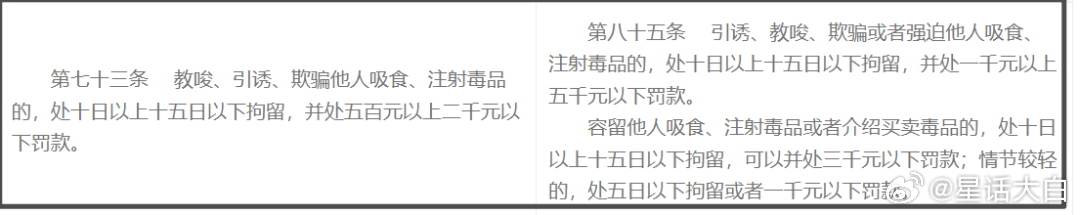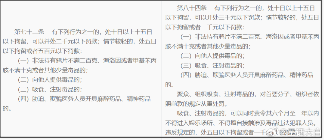 这次舆论争议闹大后,不少人也开始翻治安管理处罚法的其他涉毒行为的修改。这其中出现两个截然相反的观点。一种观点认为,新规其他涉毒行为是加大打击力度。一种观点认为,新规把其他一些违反刑法的涉毒犯罪行为,给变成治安管理违法行为,是减轻打击力度。那么我也对此做了事实核查。上一版《治安管理处罚法》是2012年实施,我将这次修改的和2012年版本做了对比。其中涉毒行为有修改和增加的内容如下。修改后的第84条提到:“有下列行为之一的,处十日以上十五日以下拘留,可以并处三千元以下罚款;”2012年该条为“并处二千元以下罚款”。罚款金额上限多了1000元。但这里争议点在于,第4点新增了:“聚众、组织吸食、注射毒品的,对首要分子、组织者依照前款的规定从重处罚。”类似地方还有修改后的第85条提到:“诱、教唆、欺骗或者强迫他人吸食、注射毒品的,处十日以上十五日以下拘留,并处一千元以上五千元以下罚款。”这个罚款之前版本是500元以上,2000元以下,同样是增加了罚款金额。争议点同样是,新增了“容留他人吸食、注射毒品或者介绍买卖毒品的,处十日以上十五日以下拘留,可以并处三千元以下罚款;情节较轻的,处五日以下拘留或者一千元以下罚款。”还有第86条提到:“违反国家规定,非法生产、经营、购买、运输用于制造毒品的原料、配剂的,处十日以上十五日以下拘留;情节较轻的,处五日以上十日以下拘留。”这个也是之前没有的。有人认为,这些是之前是属于违反刑法的犯罪行为,被挪到治安管理处罚法,是降低打击力度。对于这个说法,我也进行查证。《刑法》第350条规定:“违反国家规定,非法生产、买卖、运输醋酸酐、乙醚、三氯甲烷或者其他用于制造毒品的原料、配剂,或者携带上述物品进出境,情节较重的,处三年以下有期徒刑、拘役或者管制,并处罚金;情节严重的,处三年以上七年以下有期徒刑,并处罚金;情节特别严重的,处七年以上有期徒刑,并处罚金或者没收财产。”《刑法》第353条规定:“引诱、教唆、欺骗他人吸食、注射毒品的,处三年以下有期徒刑、拘役或者管制,并处罚金;情节严重的,处三年以上七年以下有期徒刑,并处罚金。”《刑法》第354条规定:“容留他人吸食、注射毒品的,处三年以下有期徒刑、拘役或者管制,并处罚金。”照理说,“容留他人吸食、注射毒品”都是违反刑法的犯罪行为。而“聚众、组织吸食、注射毒品”,还是“首要分子”,这性质要更恶劣,居然被写进“治安管理处罚法”。对此,一开始我也不是太理解,感觉跟刑法有一些冲突。不过,我也查了下,实际操作过程里《刑法》的优先级也是高于《治安管理处罚法》。如果出现一个人的行为,既违反《治安管理处罚法》,又违反了《刑法》,那么会有两种情况。1、单处刑罚。即对一行政违法行为己构成犯罪的,只由司法机关给以刑事处罚,行政机关不得就同一事实重复处罚2、刑罚与行政处罚双重适用。即对行为人除由司法机关予以刑罚处罚外,有关行政机关还应予以行政处罚。也就是,违反《刑法》的犯罪行为不存在只按照《治安管理处罚法》进行行政处罚,而不进行刑事处罚的情况。
