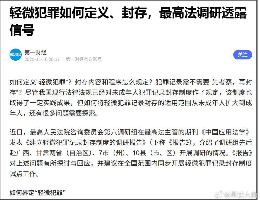 目前“轻微犯罪记录封存制度”还只是提出,还未全面推广。或者可以说,这次的“治安违法记录封存制度”推出,相当于是在给“轻微犯罪记录封存制度”探探路。而“轻微犯罪记录封存制度”如何构建,目前还处于摸索阶段。据下面这篇报道,最高人民法院咨询委员会第六调研组在最高法主管的期刊《中国应用法学》发表《建立轻微犯罪记录封存制度的调研报告》,并建议在全国范围内同步开展轻微犯罪记录封存制度试点工作。比如,如何界定“轻微犯罪”就是一个有很大分歧的事情。因为我国刑法并没有“微罪、轻罪、重罪”这样的分层标准。《报告》称,在调研中,各界普遍认同以刑罚轻重作为界定“轻微犯罪”的基础标准,但就采用宣告刑还是法定刑,分界点如何选取,是否区分故意、过失犯罪等问题,还存在较大认识分歧。《报告》指出,多数意见认为,“轻微犯罪”不应简单等同于“轻罪+微罪”,而应限定为“轻罪”中主客观方面危害性最小的一部分;在“轻微犯罪”的具体标准设置上,主要有三种意见:第一种建议将“轻微犯罪”界定为“因故意犯罪被判处一年有期徒刑以下刑罚,或因过失犯罪被判处三年有期徒刑以下刑罚”的犯罪。第二种意见认为,界定轻微犯罪范围应重点考虑封存的“受众”比例,建议原则上不超过被判刑罪犯总数的30%,建议将“轻微犯罪”严格限定为“被判处一年有期徒刑以下刑罚”的犯罪。第三种意见则建议以“被判处拘役以下刑罚”界定“轻微犯罪”的范围。《报告》称,普遍认为应将一些特定罪名排除在犯罪记录封存之外,如危害国家安全犯罪、恐怖活动犯罪、性侵犯罪、毒品犯罪、黑社会性质的组织犯罪、职务犯罪等。关于罪犯范围,各界则普遍认为应限定于初犯,排除累犯和再犯。对于试点罪名和地区该如何选择,《报告》建议,试点罪名可以优先考虑案件量大、社会影响面广的个罪先行试点,如危险驾驶罪。这个我就非常不理解了。“危险驾驶罪”这样充满主观恶意的罪名,居然被《报告》建议拿来试点。一个犯过“危险驾驶罪”的人,要是能被封存犯罪记录,这是我不太能接受的。当然,这也只是该报告的“建议”,还不是具体要这么施行。只是我个人觉得这个“建议”很不靠谱。相比已经尘埃落定的“治安违法记录封存制度”,舆论还不如多多讨论一下正在摸索中的“轻微犯罪记录封存制度”,让民意通过广泛的舆论讨论,来让最终落地的“轻微犯罪记录封存制度”更完善,更符合中国实际国情。从我个人态度来说,我对于“治安违法记录封存制度”是持不置可否的态度,不支持,也不反对。毕竟戒毒人员的信息保密制度已经施行了14年了,这时候才去纠结“吸毒记录封存”,意义不大。但对于“轻微犯罪记录封存制度”,我个人持保留意见,我还是希望对于实施“轻微犯罪记录封存制度”,还是应该慎之又慎,需要经过充分的讨论。一旦建立了“轻微犯罪记录封存制度”是否会降低刑罚的威慑力?这应该有充分考量,需要权衡取舍。在知道“轻微犯罪记录封存制度”之前,我本来还想着,对于这件事情的解决办法,我个人建议考虑把吸毒复吸入刑,这样两难自解。不过,既然有了“轻微犯罪记录封存制度”,那么即使吸毒入刑,也大概率只会被列入“轻微犯罪记录”里,到时候同样会被封存。所以,我趁“轻微犯罪记录封存制度”还没有落地,在这里呼吁,要把跟毒品相关的所有罪名,都排除出“轻微犯罪记录”,应当充分考虑这次舆论讨论里反应出来的巨大民意。民众对于毒品的零容忍,是我国长期禁毒工作的成果,不能轻易就伤了民众对于毒品零容忍的普遍共识。