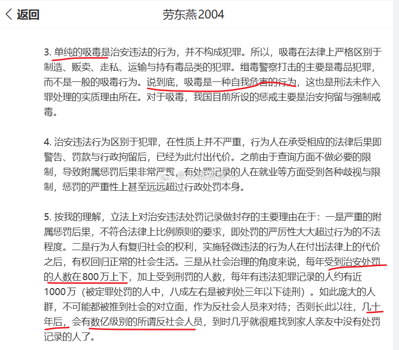 请问老师,为什么(治安处罚法修订)第三次公开的和前两次公开的不一样?答:具体过程不清楚,可能的理由参见第五点。劳老师认为,吸毒是自伤行为按这种思维逻辑,那么,穿全身黑袍、蒙面只留双眼的人,哪里伤害的社会了?为什么不允许人家穿?教授能解释清这一点吗劳老师观点第5条,“每年800万人违反治安法~~几十年后,会有数亿级别的所谓反社会人员”劳老师讲错了“人”和“人次”的字眼差别了吧?以为违反治安法者只违法一次,就改邪归正、从不再犯了吗?热点观点 ,幼师等招聘可依法查询吸毒记录 ,