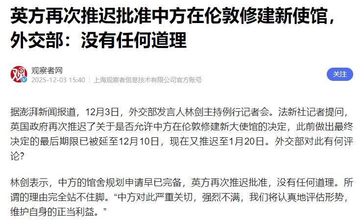 英国首相斯塔默访华要泡汤了! 今年10月的时候,英方先是借所谓“中国间谍指控”的闹剧,把原定当月的审批时间延后到12月10日。这眼瞅着新期限要到了,他们又换了个“需要征求多部门意见”的理由,把最终答复时间推到了2026年1月20日。 有意思的是,这个新日期刚好卡在斯塔默计划访华的1月底窗口期,明眼人都能看出这是在打什么小算盘,无非是学美国打算给自己造张牌罢了。而要说这事儿有多不合理,看看我们方的反应就知道。 我外交部在12月3日的例行记者会上直接表态,称英方的理由“完全站不住脚”,中方对此“严重关切,强烈不满”。驻英使馆也多次强调,新馆舍规划早就符合当地规定和外交惯例,连英国军情五处、六处这些情报机构都已“开绿灯”,内政部和外交部也明确表示“不反对”,可就是在最后一步卡壳,这实在说不过去。 斯塔默政府现在的处境其实挺拧巴,典型的“既要又要”。一方面,他们清楚英国经济离不开中国市场——中英贸易额近1000亿英镑,金融、制药、奢侈品等行业都指着中国订单过日子,所以才忙着派商贸大臣凯尔、财政大臣里德等高官密集访华,喊着“亲商”口号。 可另一方面,又怕被国内反对党抓住把柄,任由保守党和自由民主党炒作“安全风险”,说什么新使馆靠近伦敦金融城会有“间谍威胁”,这套陈词滥调翻来覆去炒,也不知道哪里来的底气。 最有意思的还是时间点的巧合,斯塔默团队早就放出风说明年1月底访华,原本外界都以为12月10日的审批会是“见面礼”,毕竟军情五处都点头了,可没想到又来这么一出,明摆着是想把这个事留到访华时当筹码。 可谈判讲究的是相互尊重,哪有拿着别人应得的权益当要挟的道理?我们早就放话,要是申请最终没过,后续肯定会有“后果”,这话虽然没说透,但意思很明确——没诚意就别谈合作。 现在距离1月20日的新日期还有一个多月,斯塔默要是真想来华谈成点事,就得拿出点实际行动。七年的拖延已经让这个使馆项目超越了建筑本身的意义,成了检验中英互信的试金石。 英国要是还抱着“拖一拖就能占上风”的侥幸心理,继续在这种原则问题上耍小聪明,别说经贸合作要泡汤,恐怕连他心心念念的访华行程,也得跟着黄了。