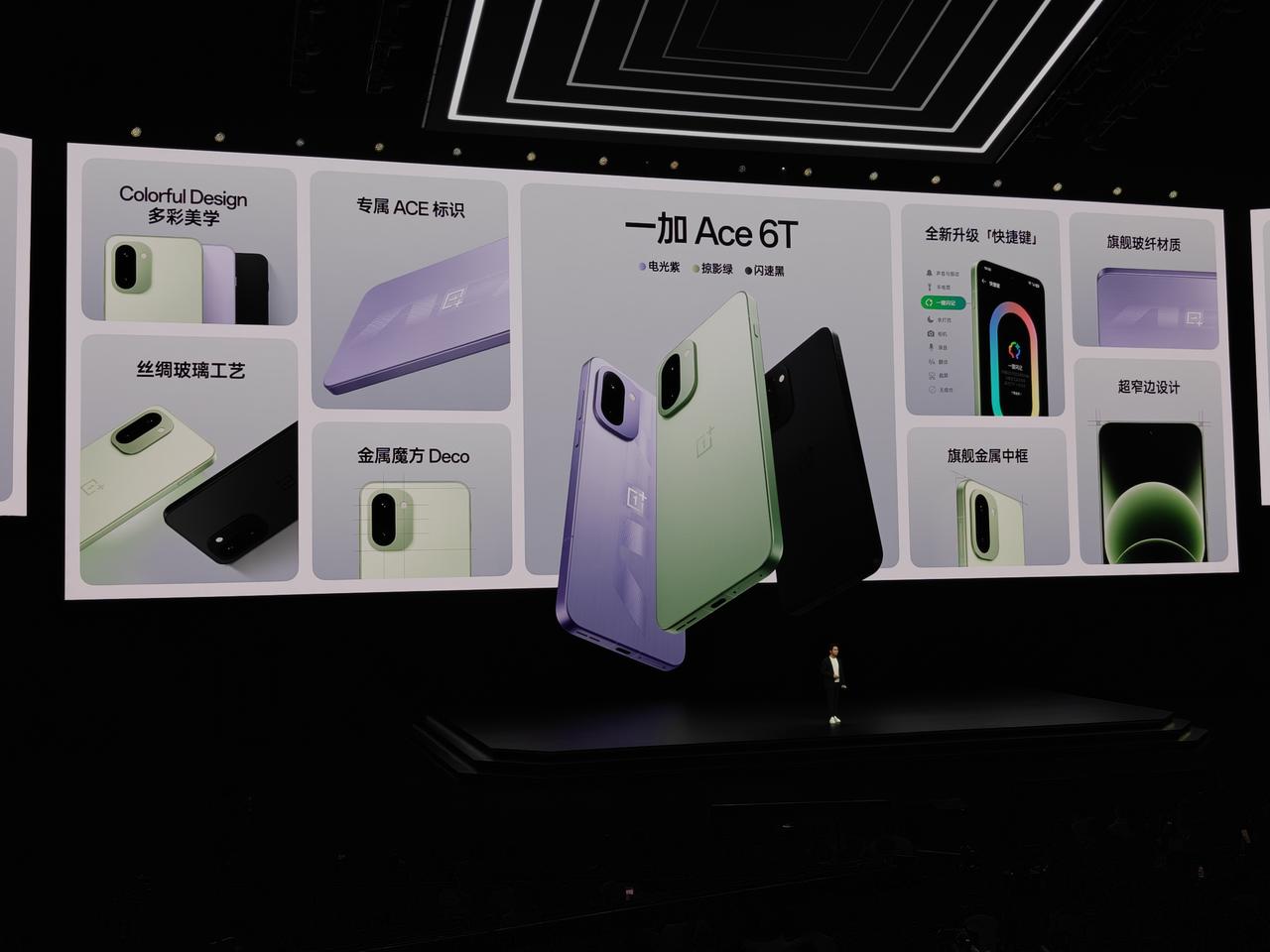 一加Ace 6T外观设计一览: 家族语言风格,简约设计,金属魔方deco,自定义快捷键,金属中框,超窄边框,直屏,三款配色。