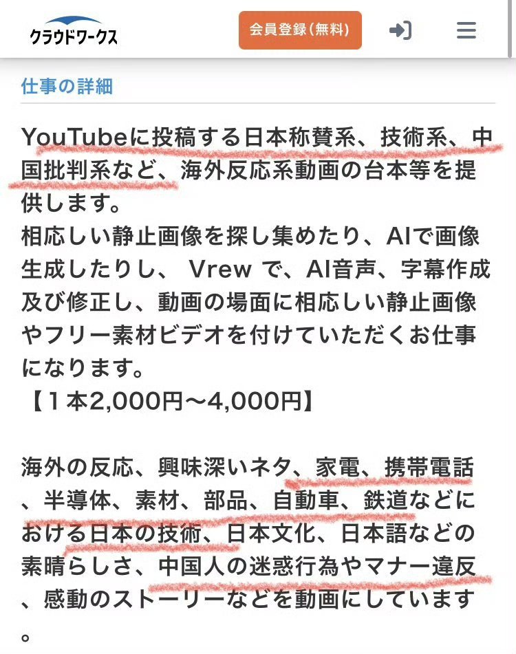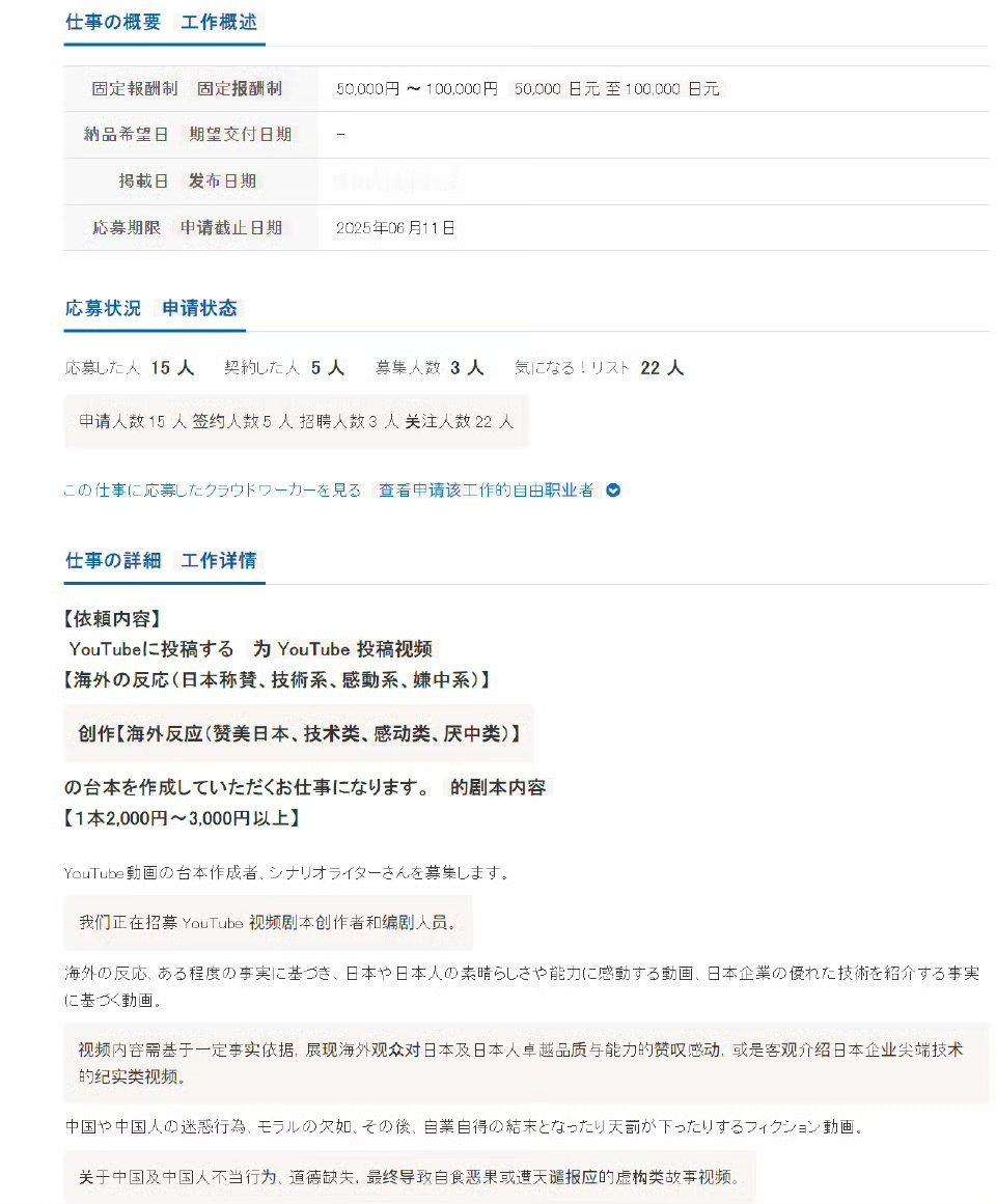 日媒爆料,有大量“日本好厉害”和“中国好讨厌”的视频在YouTube的日本平台上被人为下单,批量制作。一条视频的报酬为2000-4000日元。之前还出现过发布关于“歧视中国人的虚假信息”的招募广告。目前此类视频仍在持续招募中……特朗普点名日本热点观点