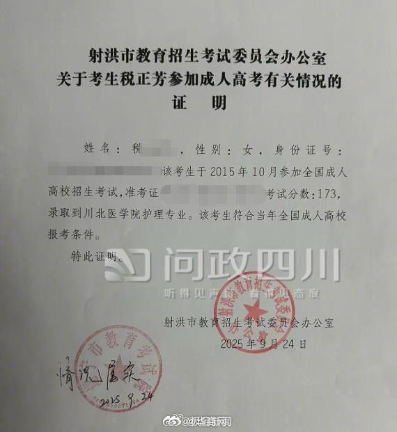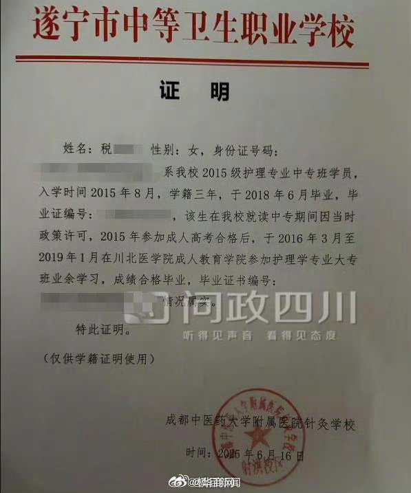 #考编第1名却因学历重叠政审不合格#【26岁女子考事业编获岗位第1名,却因因“学历重叠”政审不合格】#多方回应考编因学历重叠政审不合格#近日,四川射洪市1999年出生的税女士在问政四川求助称,她参加2025年上半年射洪市事业单位考试,并获得医疗岗位综合成绩第1名的成绩,但在政审过程中因“中专与成人大专学历时间重叠”,被判定不合格。税女士介绍,她中专于2015年-2018年就读成都中医药大学附属医院针灸学校,成人大专则于2015年10月报考川北医学院护理专业,并于2016年至2019年通过学习获得毕业证。她在参加事业单位考试时,笔试面试阶段学历材料均审核通过,政审阶段射洪市卫健局认为此为“学历套读”属于违规,口头解释其不合格。11月28日,射洪市12345政府服务热线受理中心回复道,根据《四川省2015年成人高校招生工作的通知》,成人高考报名条件一栏明确是“国家承认学历的各类高、中等学校在校生以外的从业人员和社会其他人员”。税女士在报考时,正在成都中医药大学附属针灸学院中专就读,与招考简章内的报考条件相违背。税女士在问政四川上展示了多份证明材料。其中成都中医药大学附属针灸学院出具的证明写道,税女士系该校2015级护理专业中专班学员,入学时间2015年8月,学籍三年,于2018年6月毕业。该生在该校就读中专期间因当时政策许可,2015年参加成人高考合格后,于2016年3月至2019年1月在川北医学院成人教育学院参加护理学专业大专班业余学习,成绩合格毕业。射洪市教育招生考试委员会办公室出具的证明也表明,该考生于2015年10月参加全国成人高校招生考试,录取到川北医学院护理专业。该考生符合当年全国成人高校报考条件。12月3日,记者就此咨询射洪市卫生健康局人事部门,工作人员表示,相关情况由该科室相关负责人负责。记者注意到,2024年四川南充一位网友也咨询了类似问题,其表示中专学历与大专学历存在学历时间重叠(2010年7月中专已毕业,大专2009年9月就开始了),在未取得中专学历时就开始了大专的学习,担心参加公务员、事业单位考试时影响政审。南充市人社局答复该网友称,在事业单位招聘中,学历是否符合招聘要求,主要审查学历取得渠道和学历证书是否符合国家教育行政主管部门相关规定;政治审查具体内容,以招聘公告中关于考察环节的要求为准。(极目新闻记者 谢茂)